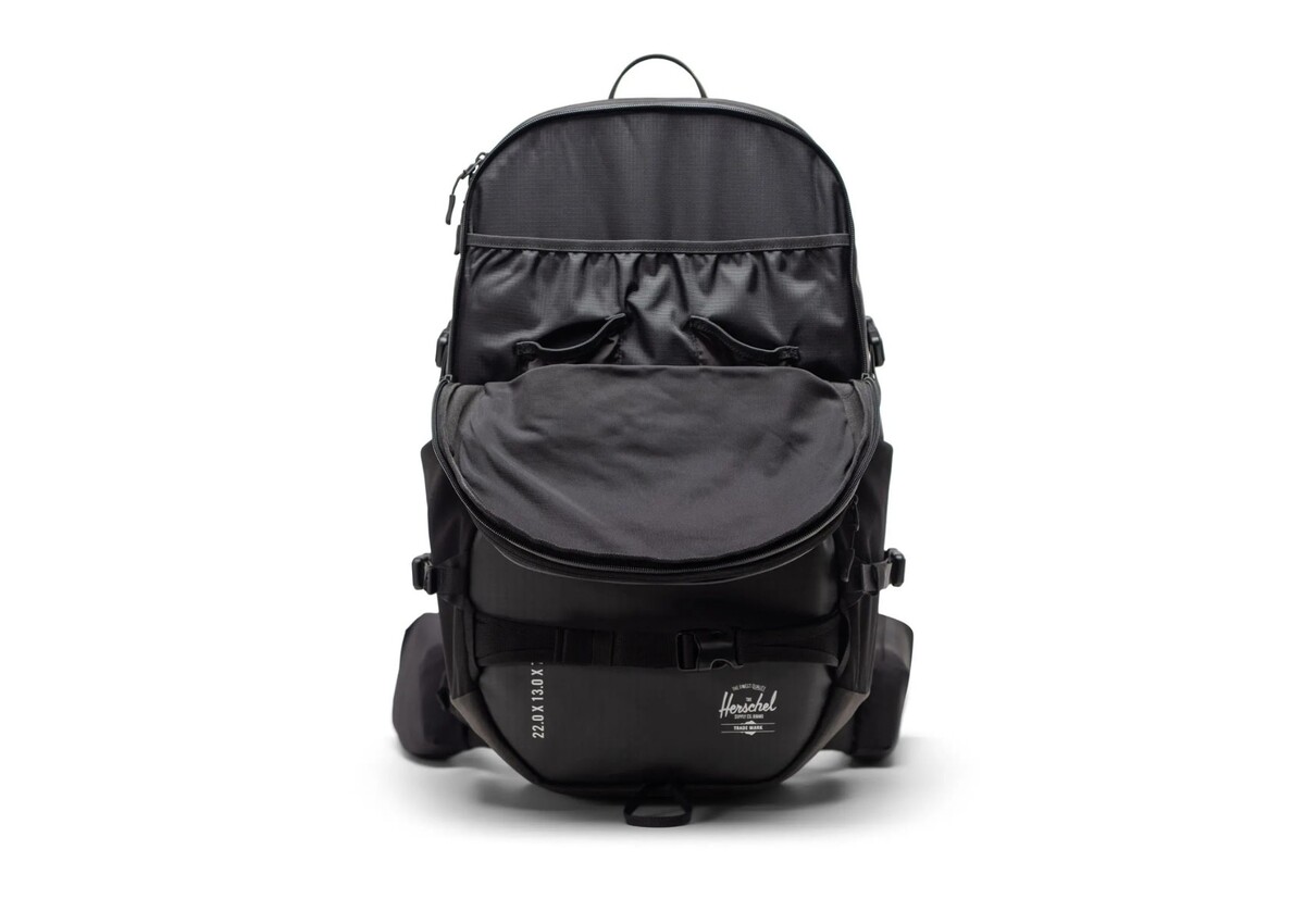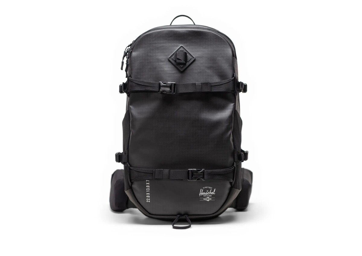 Introducing Herschel Outdoor Equipment™. Made with custom All Season fabric and designed for back-country touring, this backpack features multi-purpose utility straps for gear attachment and a spacious dual-access main compartment. Packed with safety features, it includes a convenient strap pocket to fit most standard sized rescue radios and GPS devices, a sternum strap with a rescue whistle and a front compartment with integrated sleeves for safety tools.