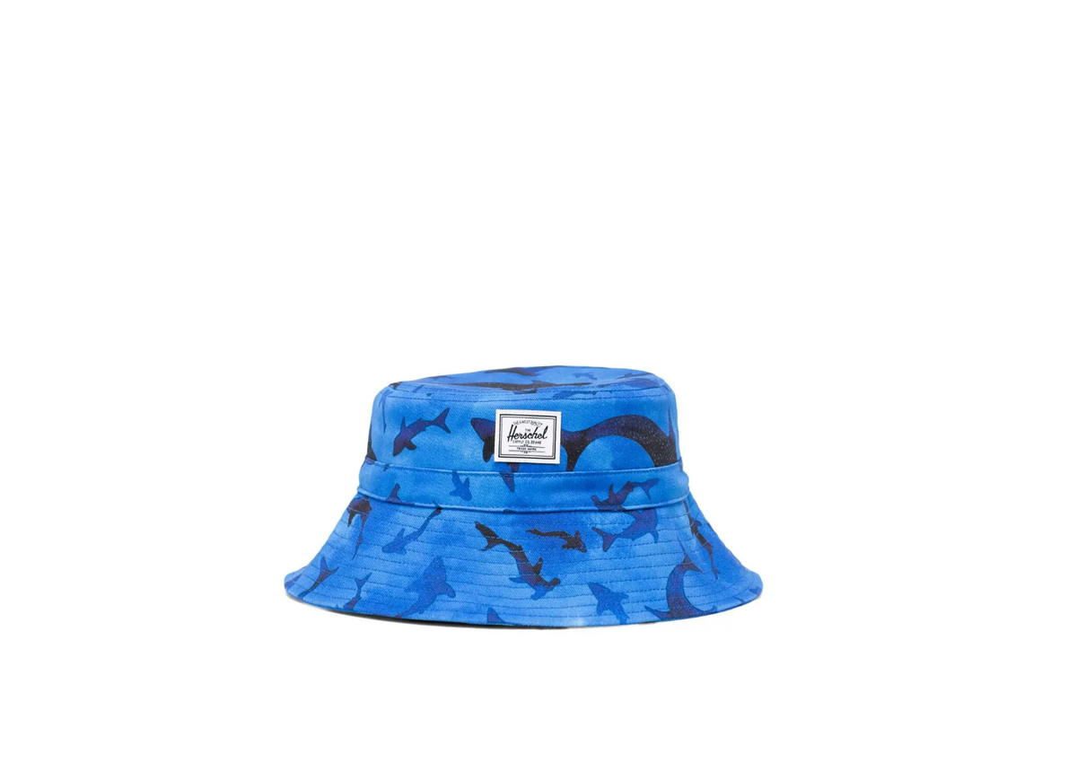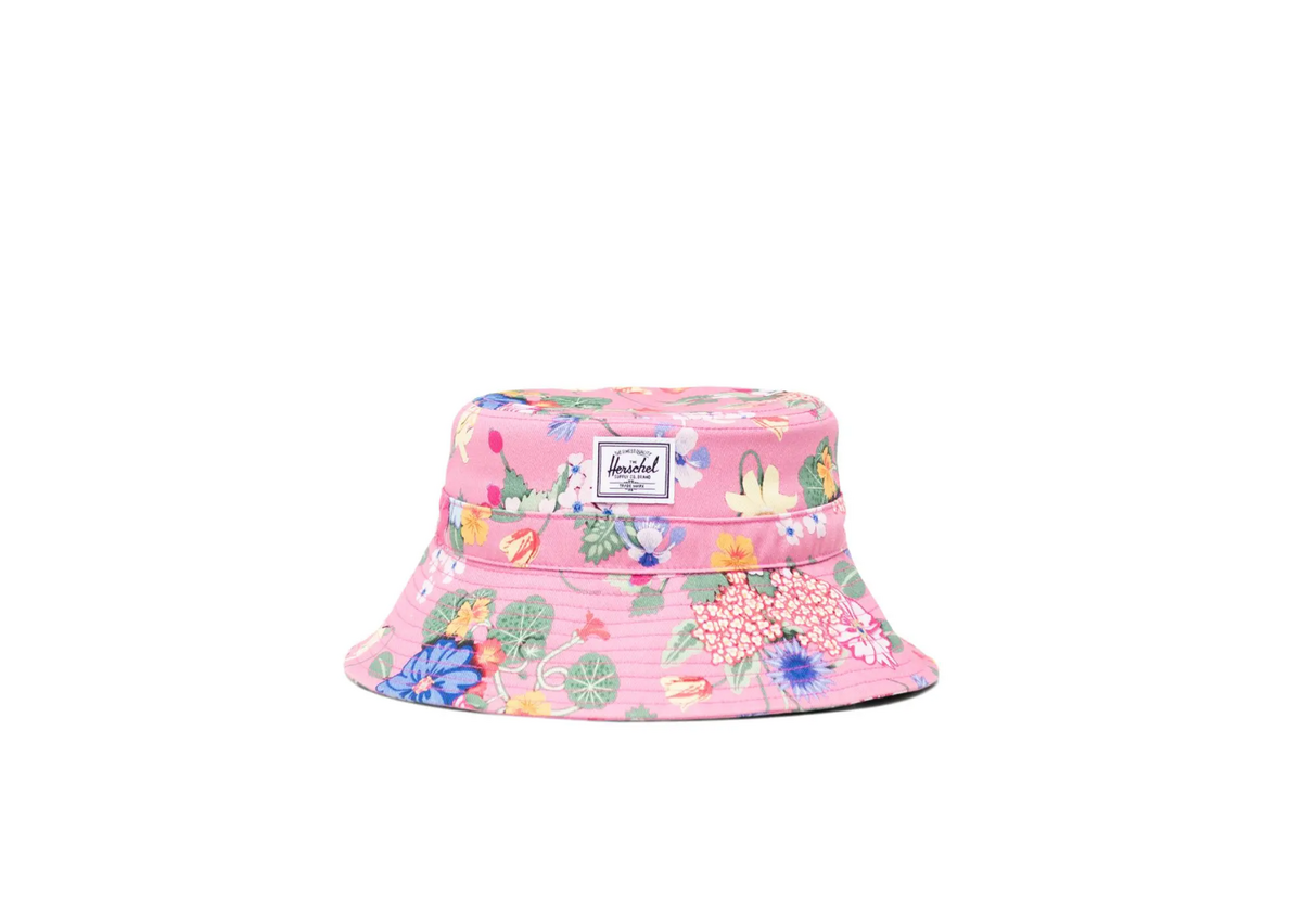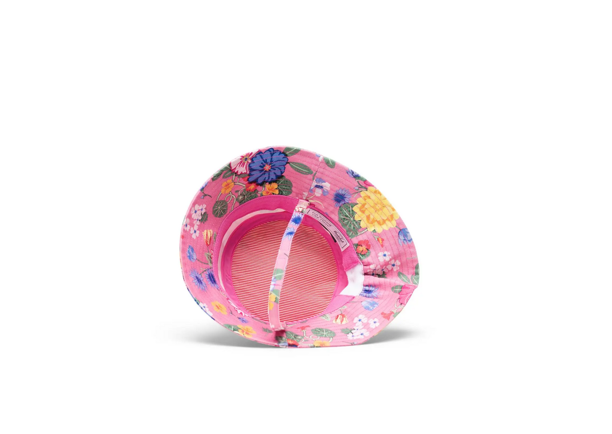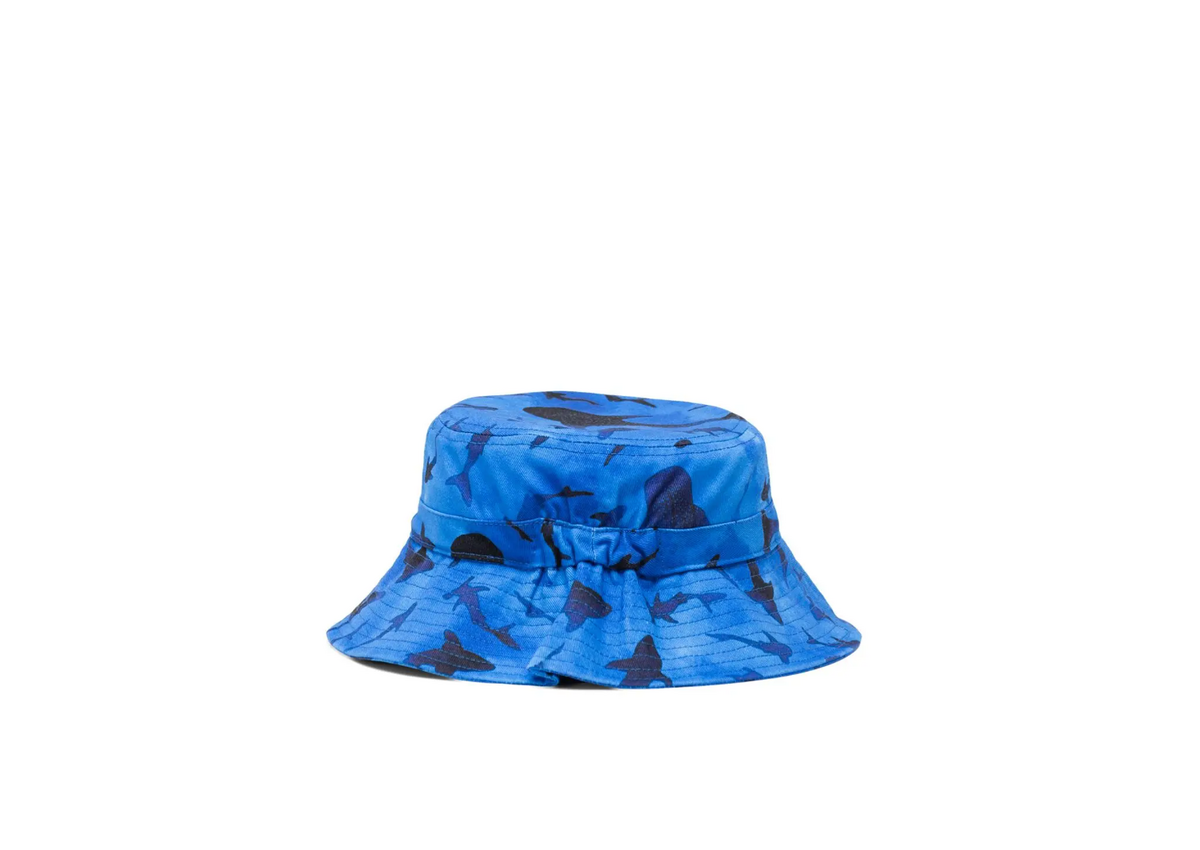 A warm weather essential, sized for children 6 – 18 months old. This bucket hat is made with a detachable self-fastening strap and wide brim to shield their face from the sun.