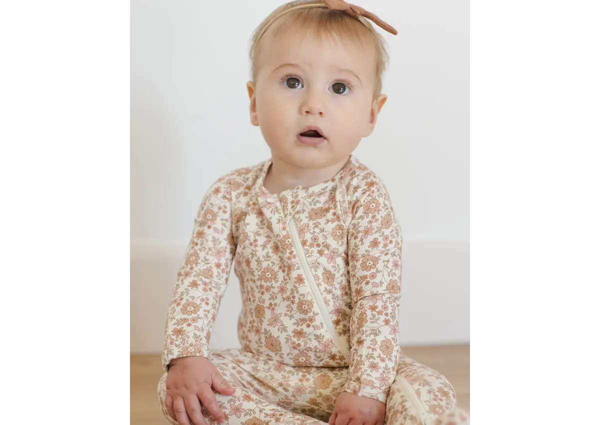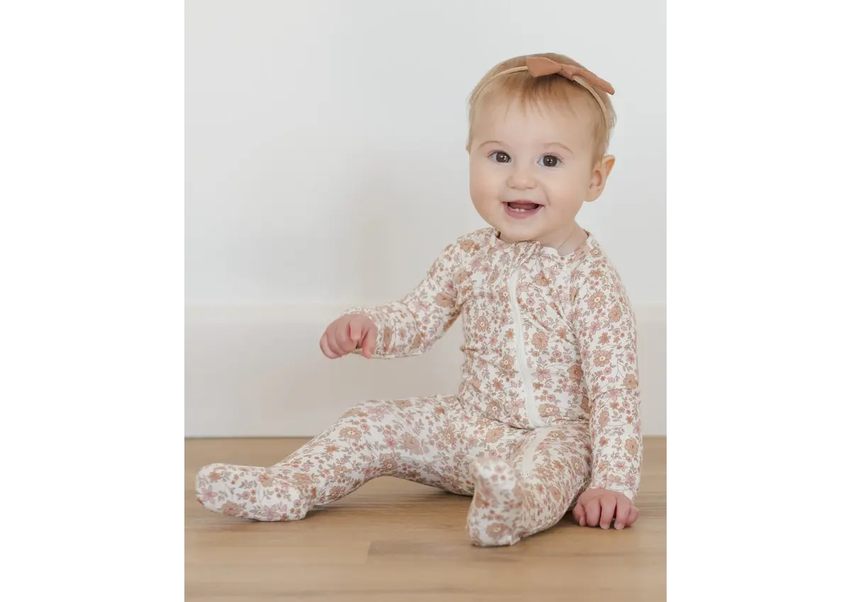 Full double-zip footie crafted from our soft and stretchy bamboo fabric. Fold-over hand mitts included on sizes NB – 3-6M.