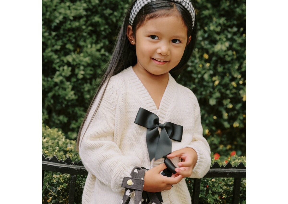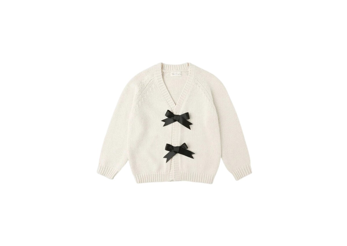 V-neck cardigan with relaxed raglan sleeves and a two-button placket accented by fixed bows for a sweet, gentle touch.