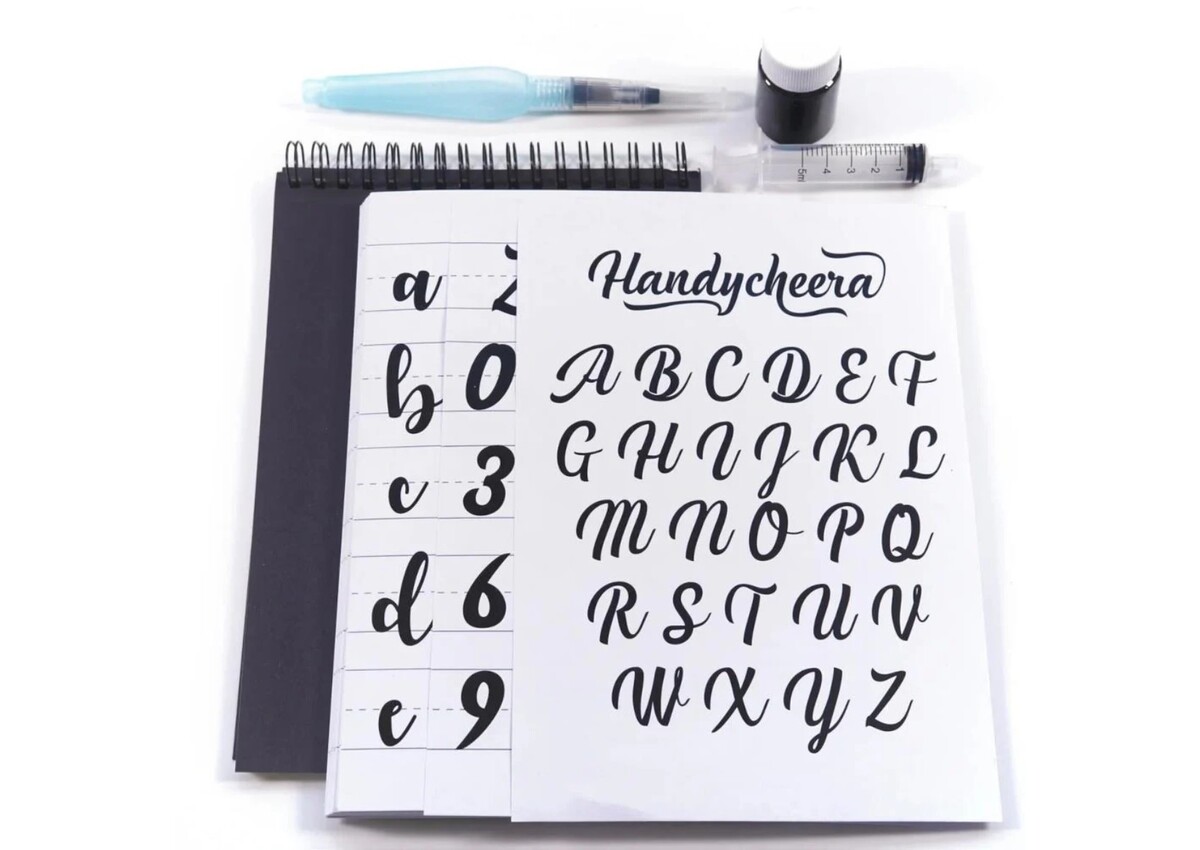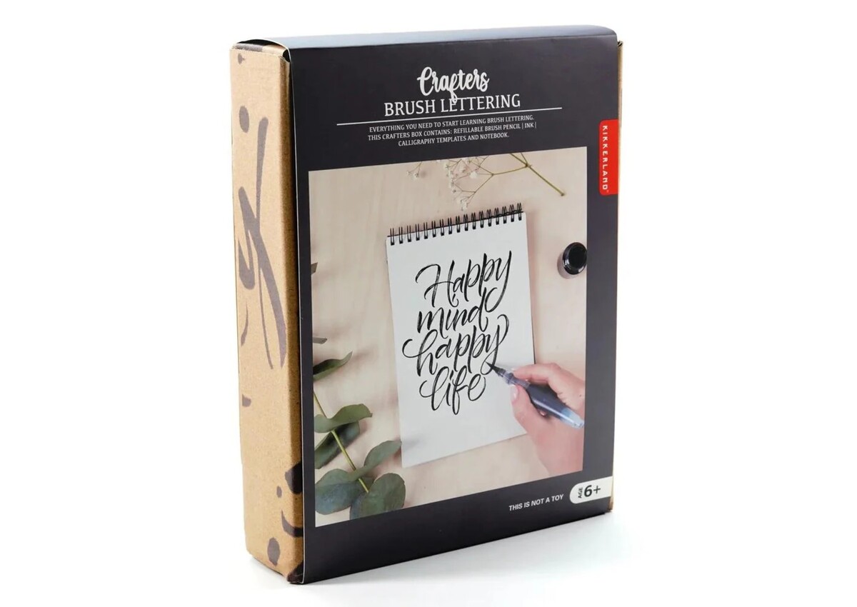 This kit contains everything you need to learn the fun and relaxing art of modern brush lettering. Refillable brush, black ink, templates, instructions and notebook.
