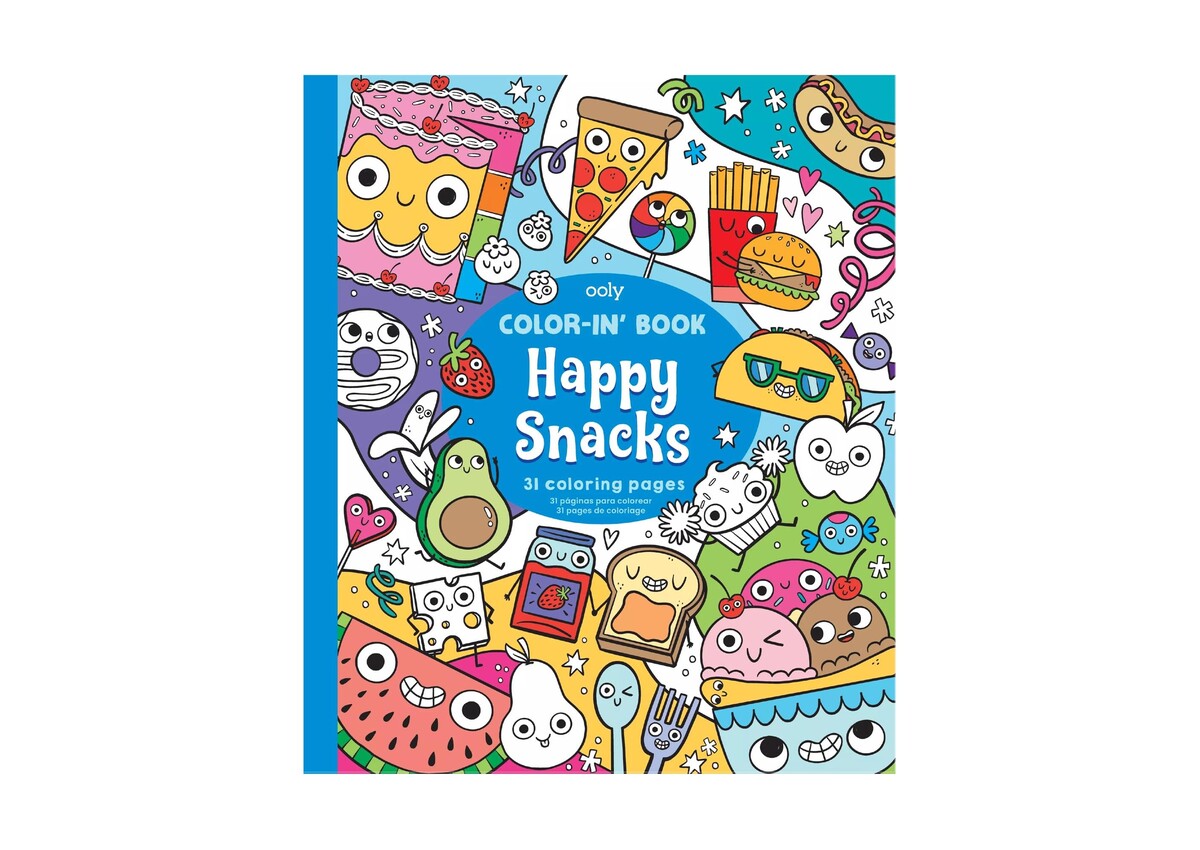 - Coloring book includes funny illustrations of happy snacks including pizza, ice cream, cupcakes, and more