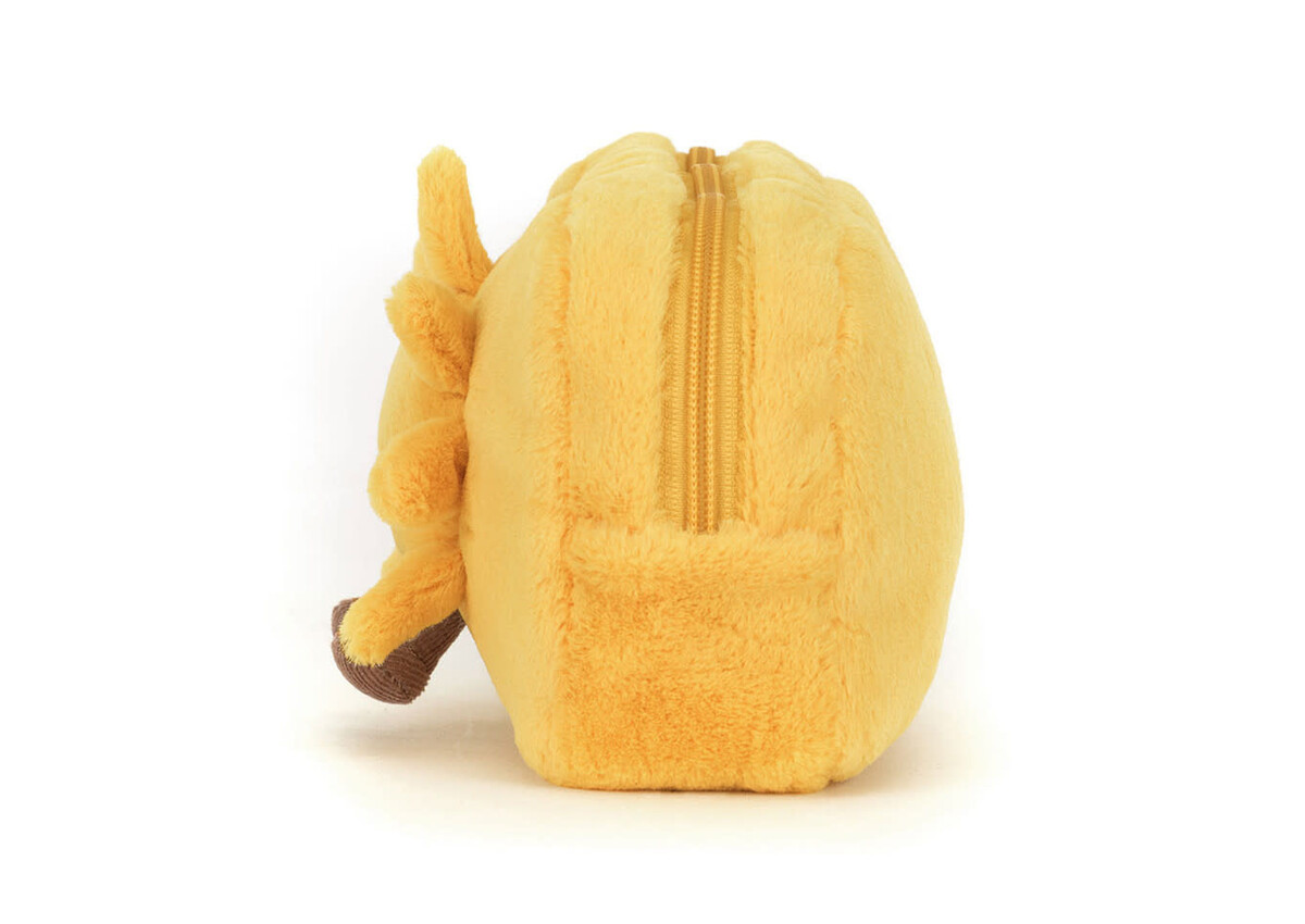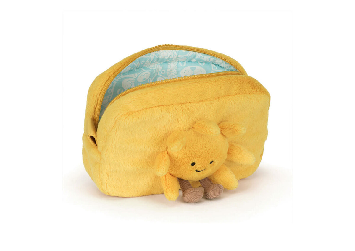 Finished with yellow fur, tiny boots and a zip-top close, this accessory staple is modeled after Amuseables Sun: amateur weather presenter (her motto: optimism first, accuracy second) and general joy to be around.