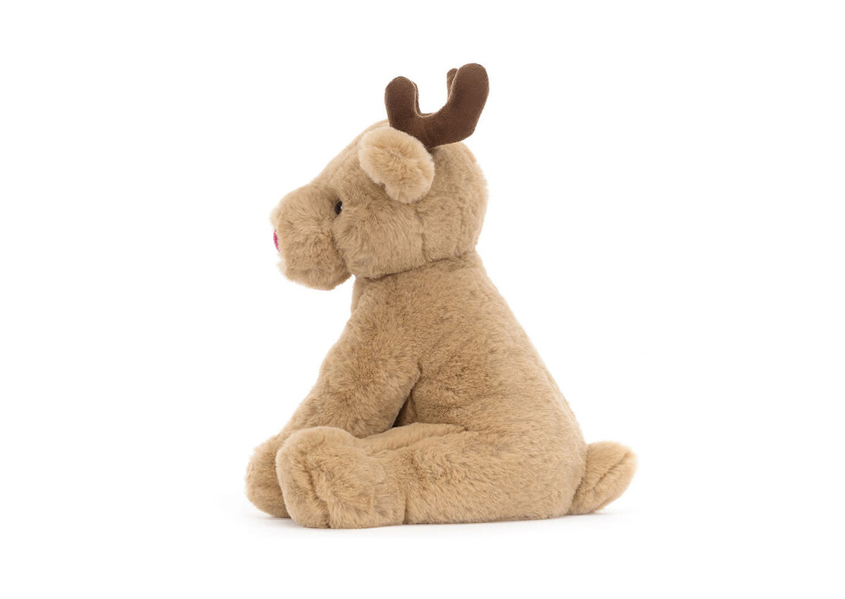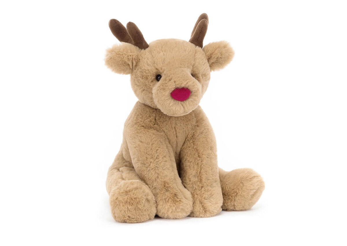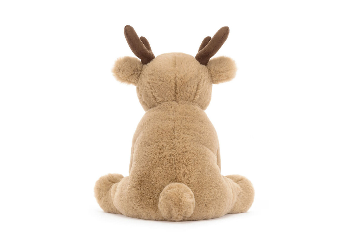 Romi Reindeer brings sleigh-loads of festive joy. This scrumptious honey deer has huge weighted paws and suedette antlers in rich cocoa tones – not to mention their delicate tufty tail, cranberry nose and waggle ears.