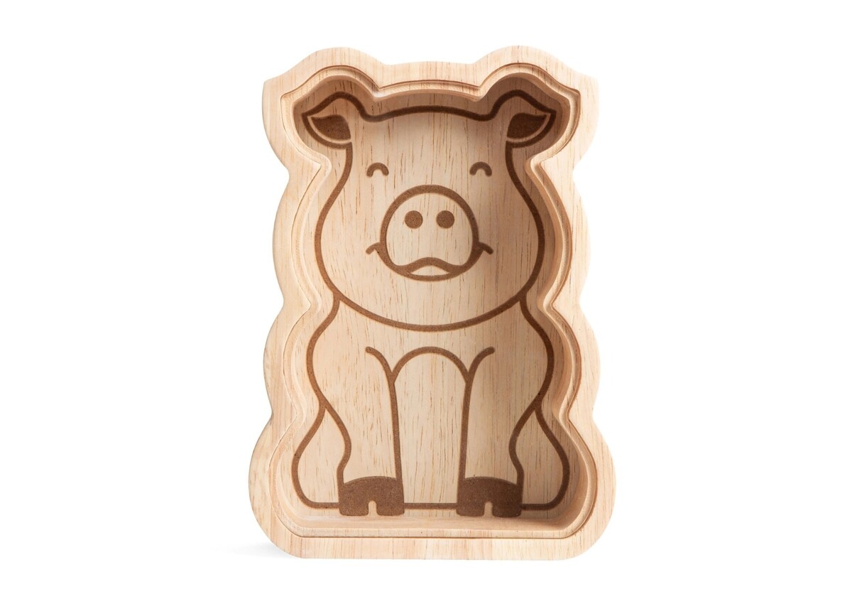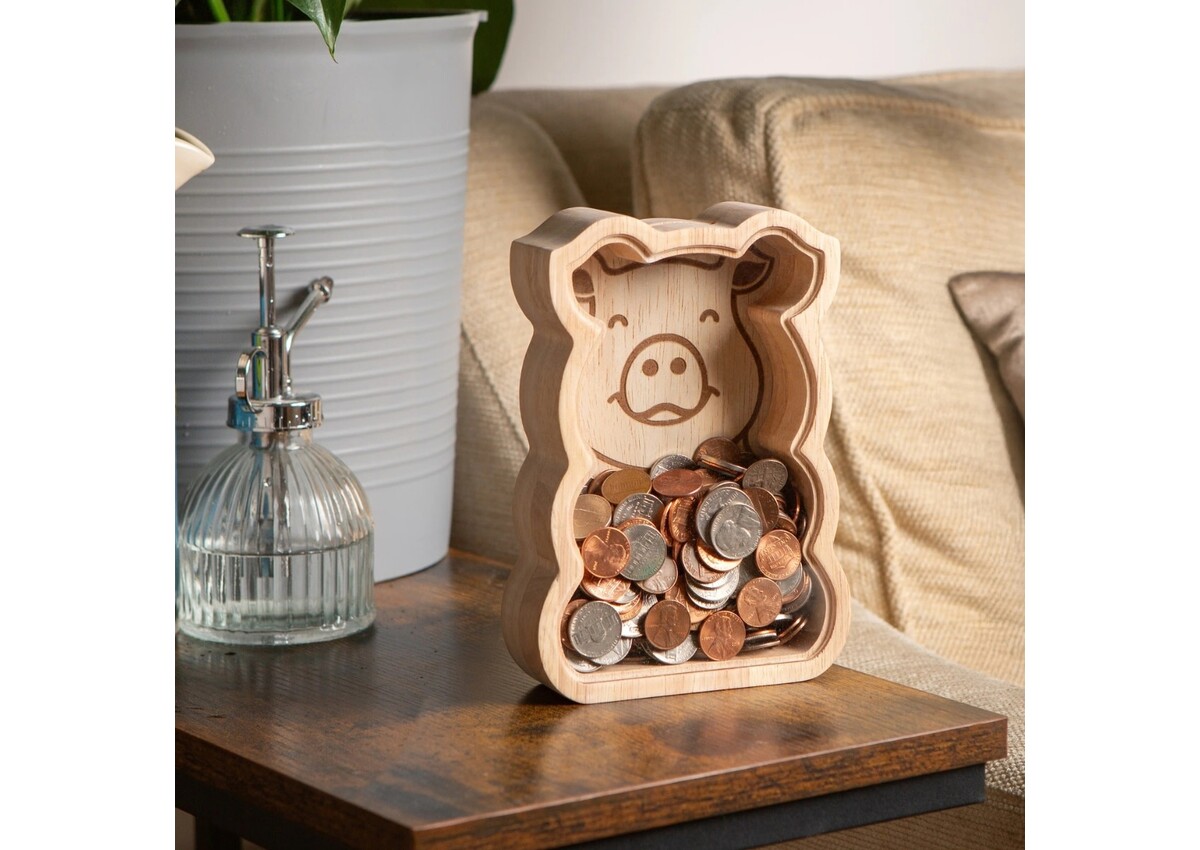 Coink! Keep your change with this pig-shaped wooden money bank. Open the back panel by removing screws.