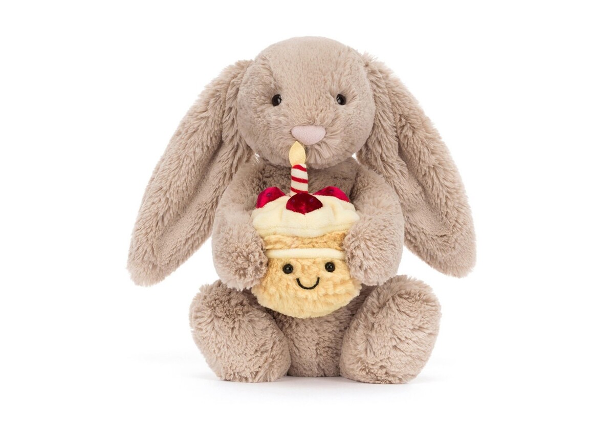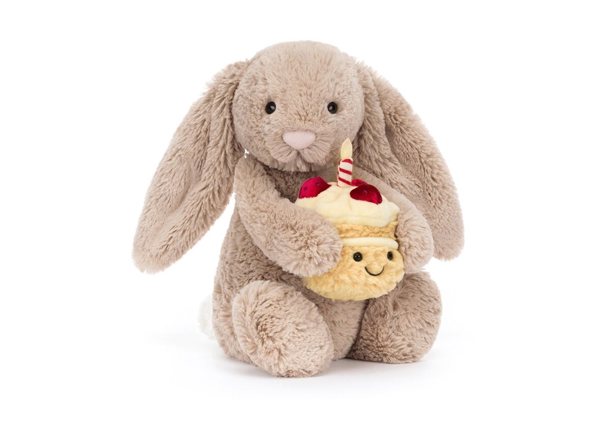 Invite Bashful Beige Bunny ‘Birthday’ along for the most joyful celebrations. Soft and sweet in beige fur, our iconic Bashful Bunny is holding a tiny, textured Amuseables Birthday Cake, topped with soft cream icing, velveteen strawberries, and a striped candle already lit with a suedette flame.