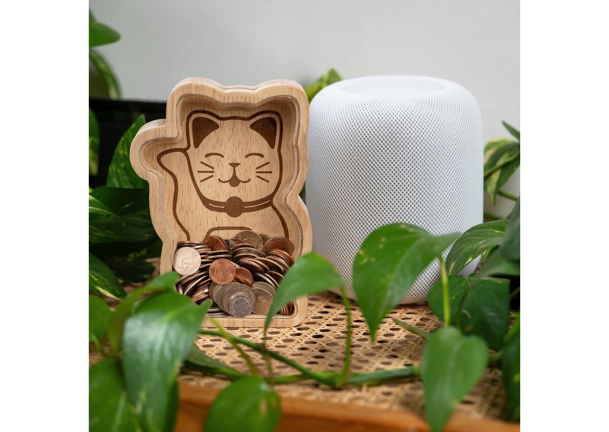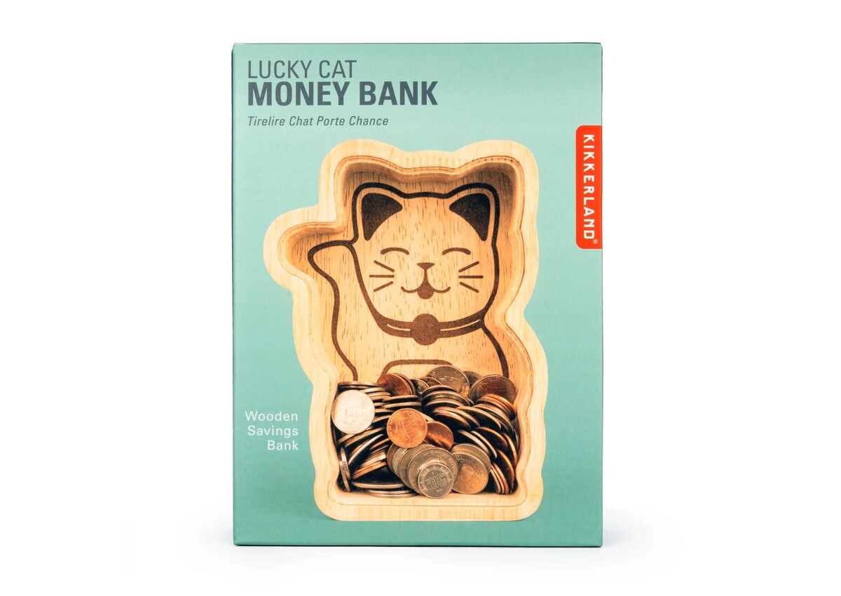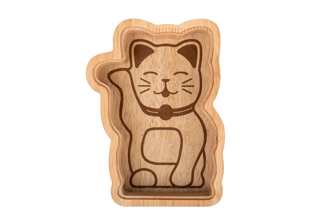 This wooden money bank shaped like a lucky cat or maneki-neko, is thought to bring good fortune to its owner in Japanese tradition. Backside panel opens by removing screws.