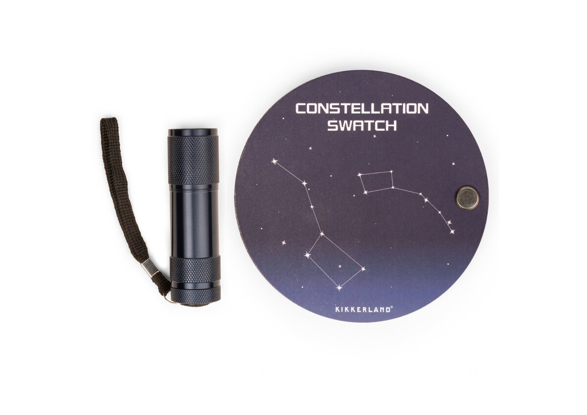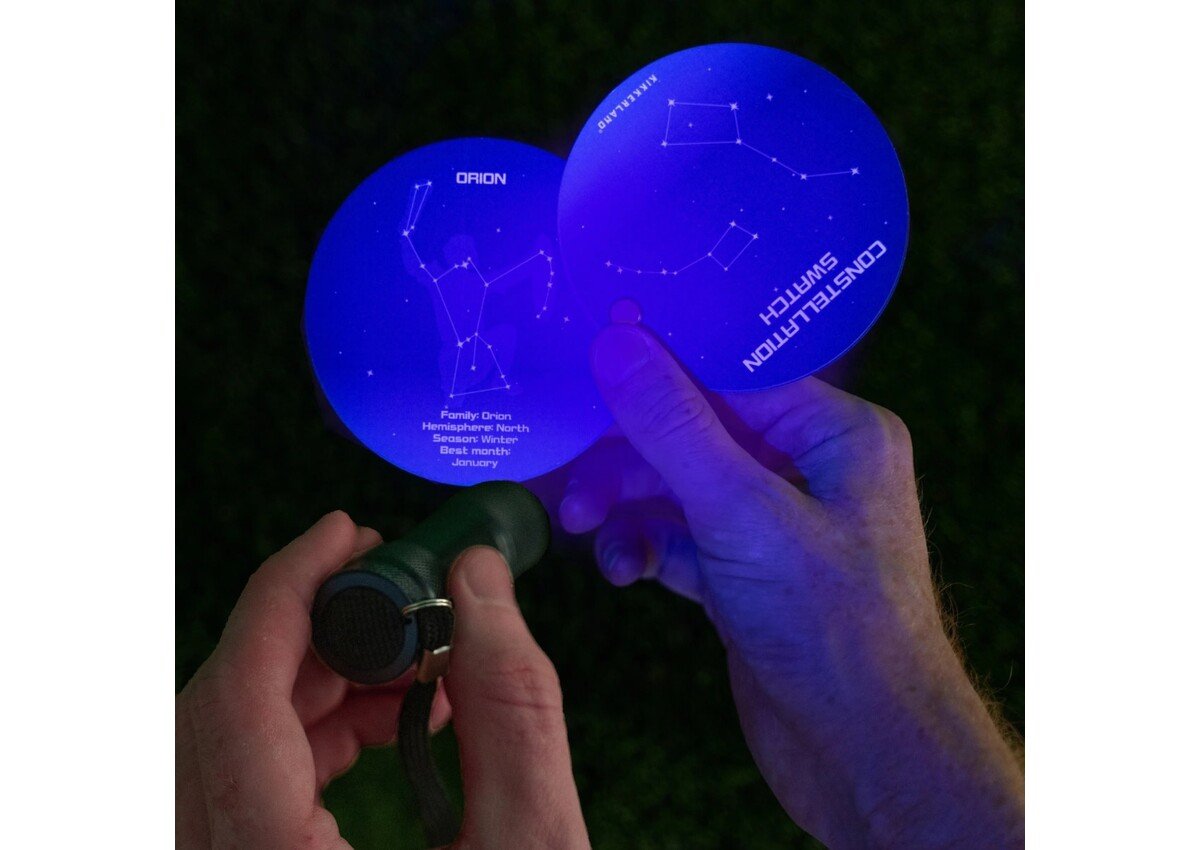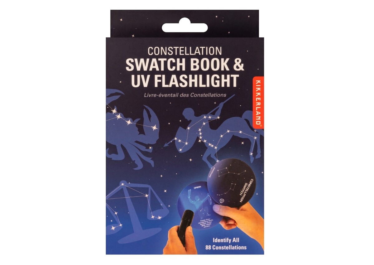 Explore the night sky by illuminating the 88 constellations in the swatch book with the UV flashlight. Requires 3 AAA batteries.