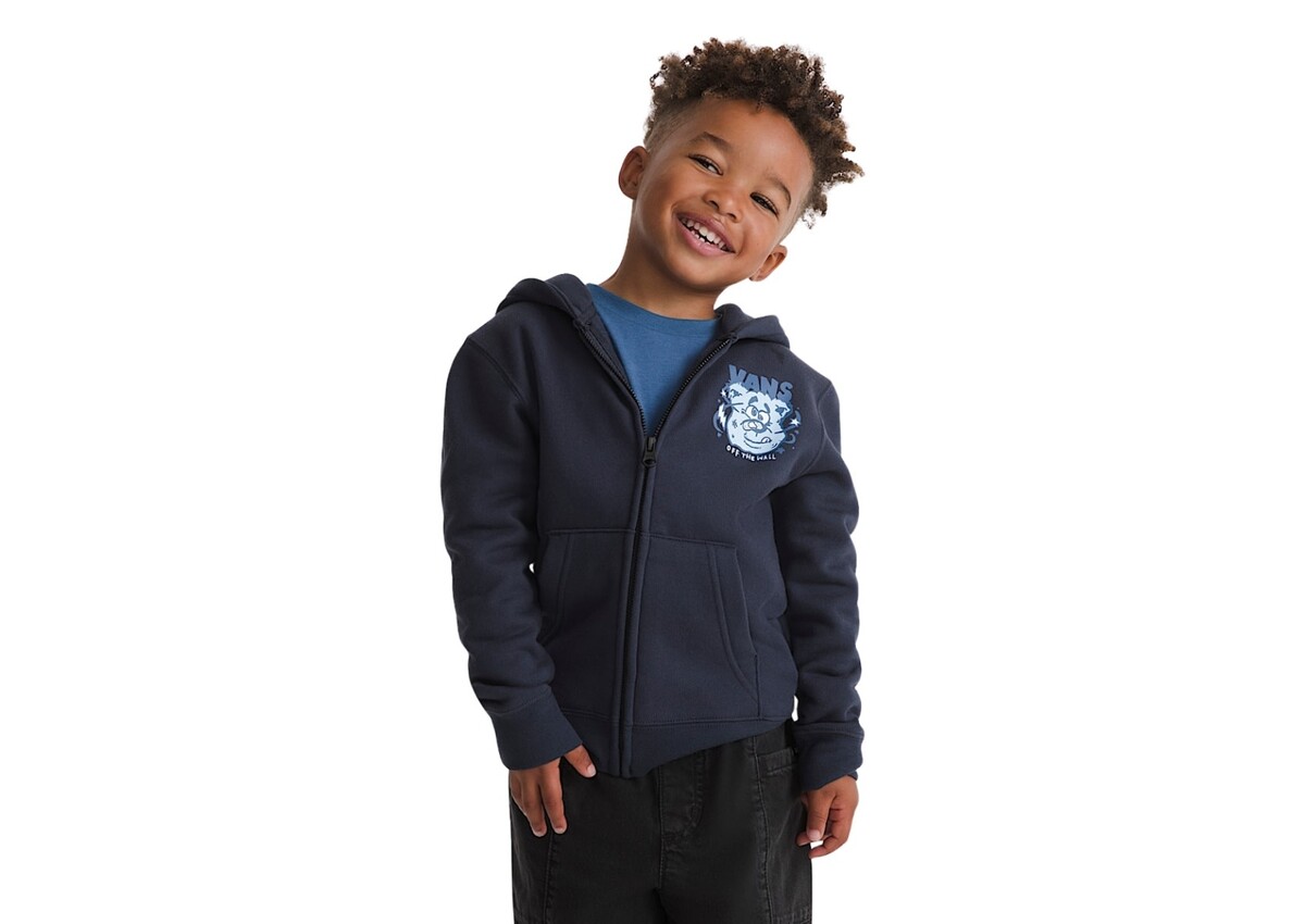 Beat the spins in the Little Kids Dizzy Bear Zip Hoodie, with a soft brushed interior for comfort and warmth, and long sleeves for added coverage. Screen print artwork on the front and back features long lasting design, with dizzy bears amid a Vans logo.