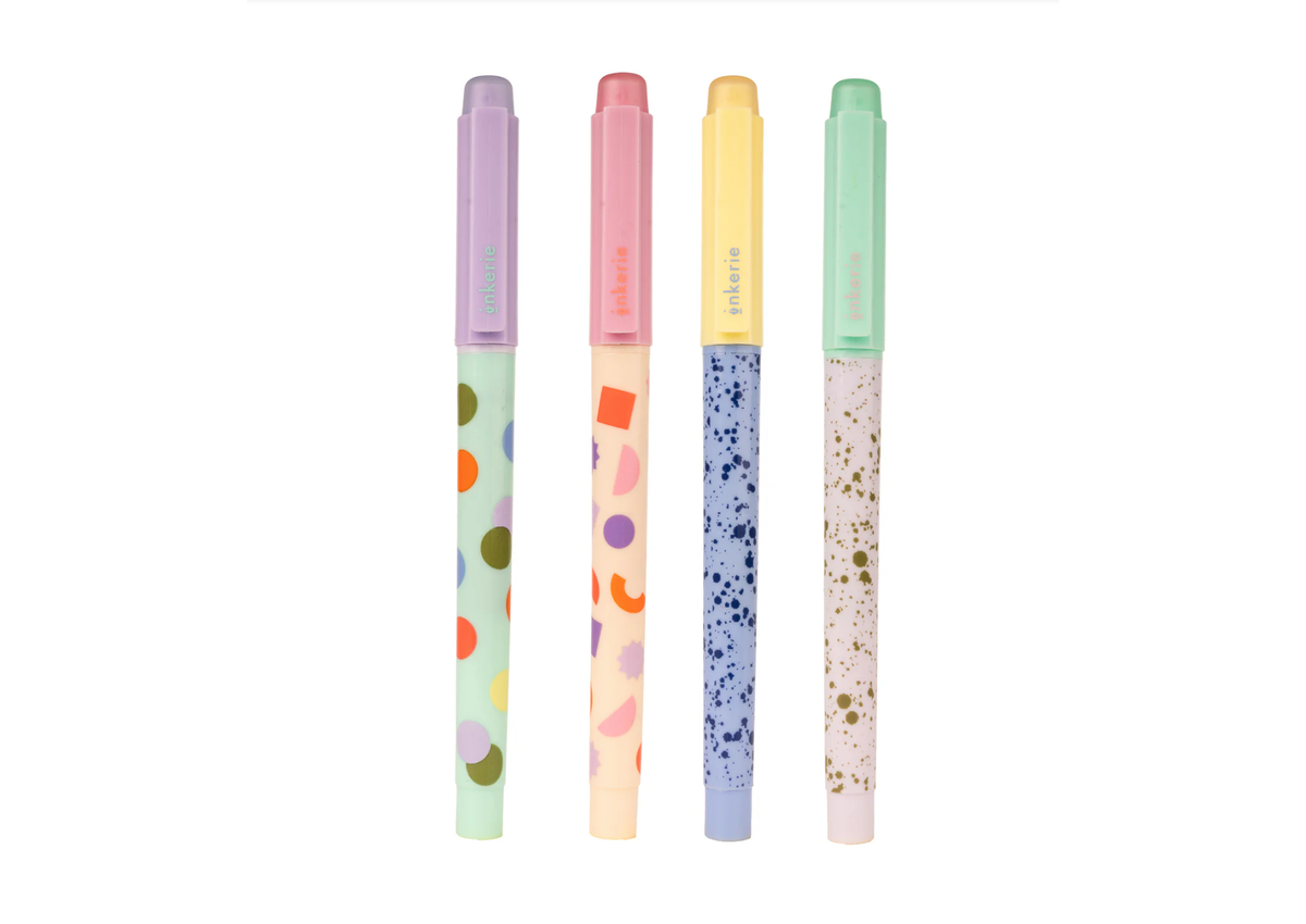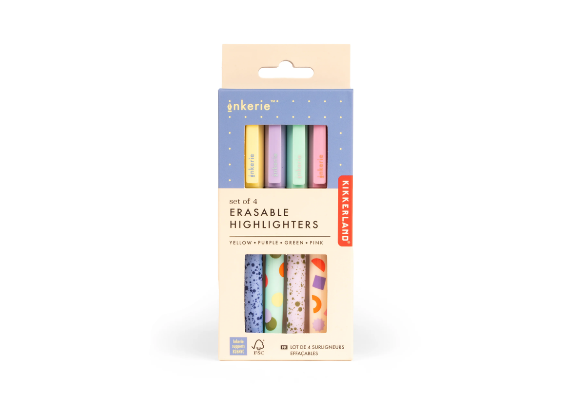 Highlight with precision! These colorful highlighters have slim tips and amazing erasable ink, so you can always keep your work neat. Includes: pink, purple, green and yellow ink.