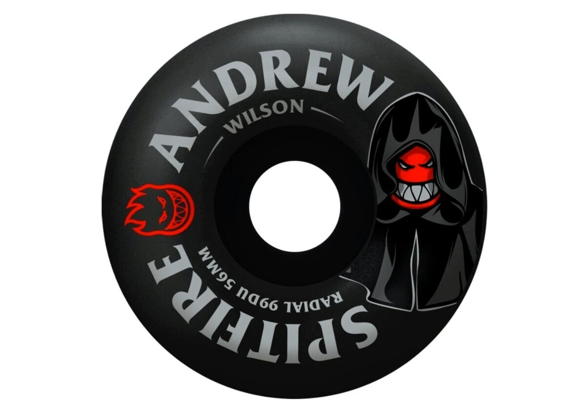 Spitfire Andrew Wilson Burn Squad F4 Radials – 56mm 99A. Blacked-out, tough as nails, and flatspot-proof.