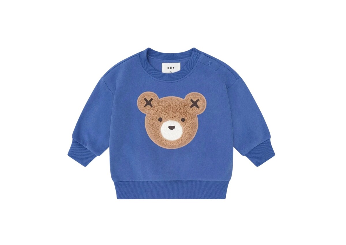 Stay warm and cosy in this fluffy blue sweatshirt. Made from 100% organic cotton terry, it feels like having your best friend by your side thanks to the tummy-sized Huxbear embroidery always within arm’s reach. Baby sizes include stainless steel back snaps for easy dressing.