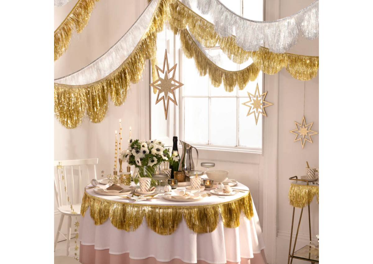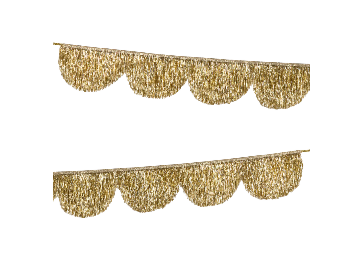 Tinsel is back in style, so let this shimmering decoration add joy and cheer to your home for a chic Christmas and New Year! Made with a stylish scalloped shape, this two-tiered gold garland with a gold glitter ribbon will look dazzling on your mantel, in the window or swaying on the porch. Reusable, bring it out year after year to add sparkle to this special season.