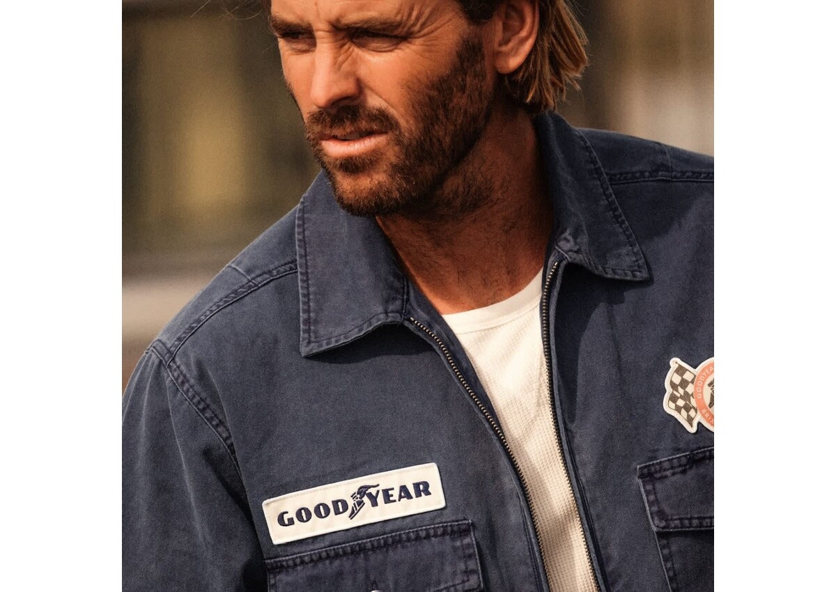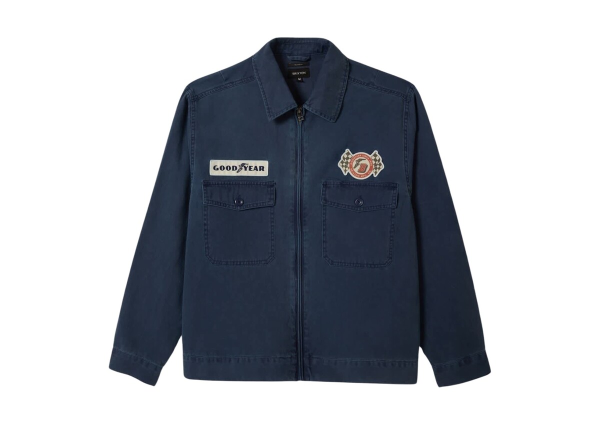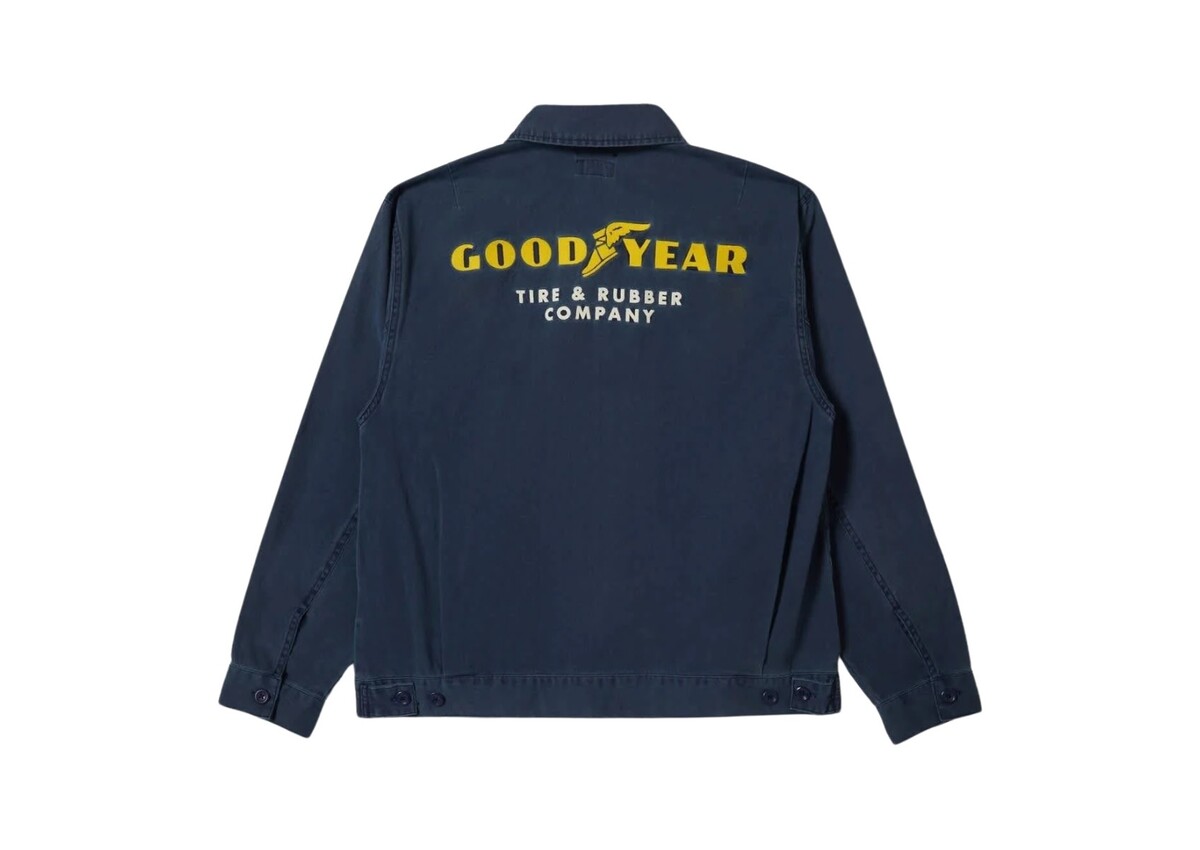 A sturdy garage jacket with embroidered details, practical features, and unmistakable Goodyear style.