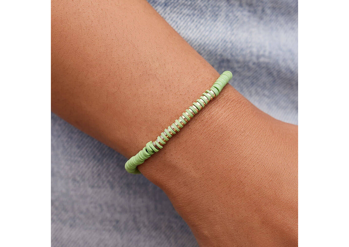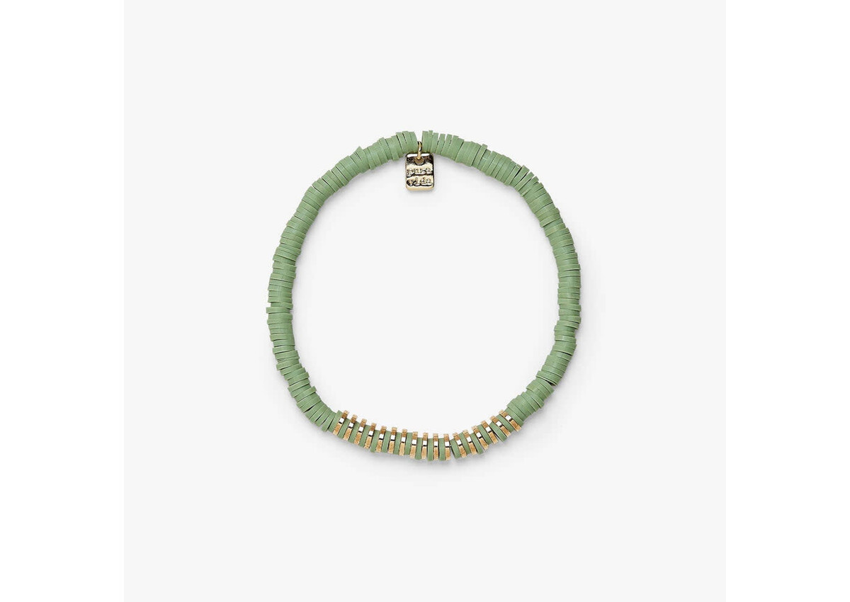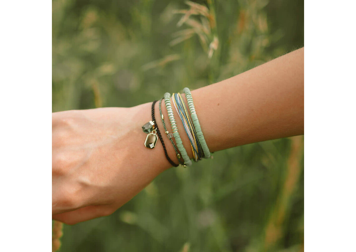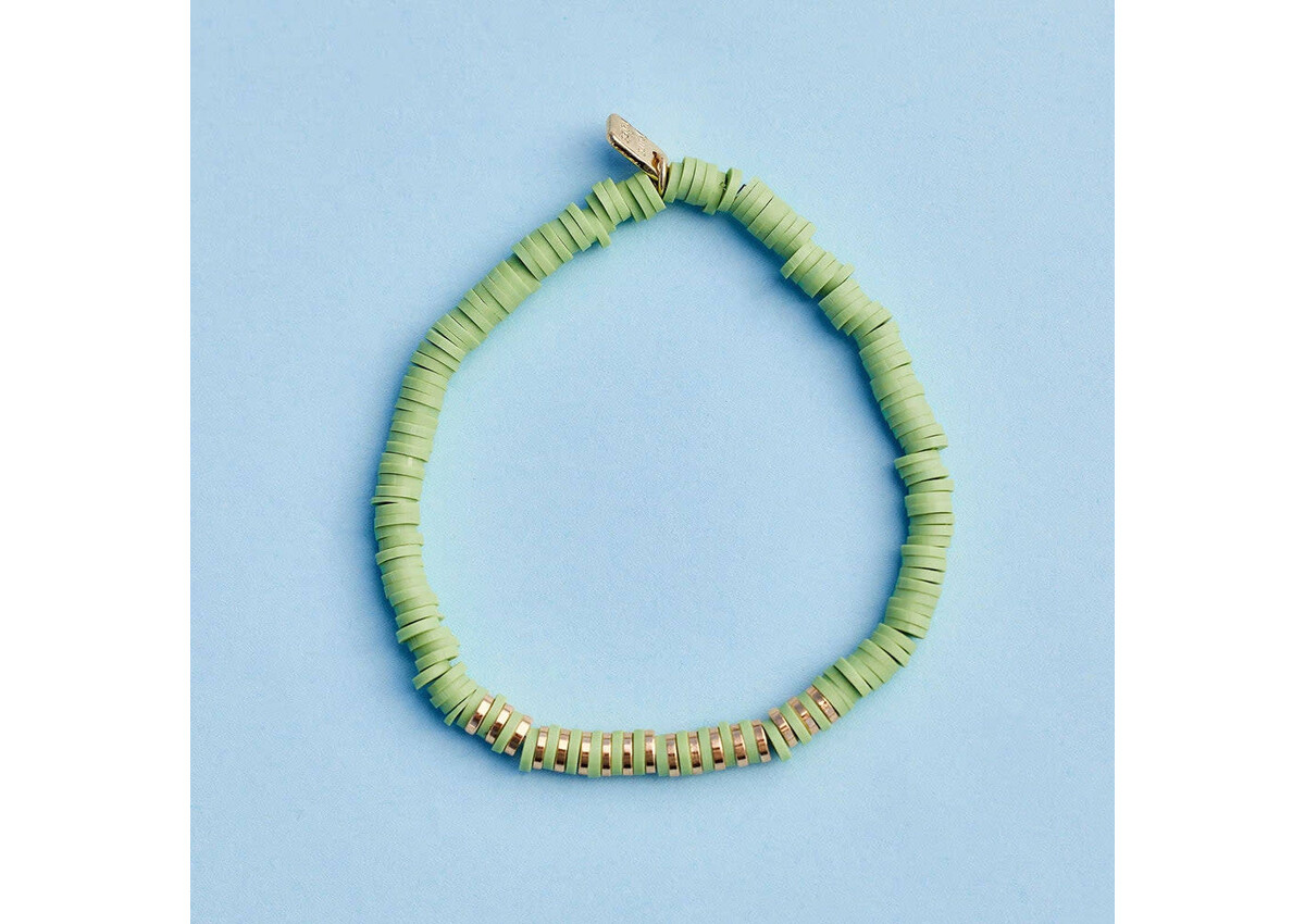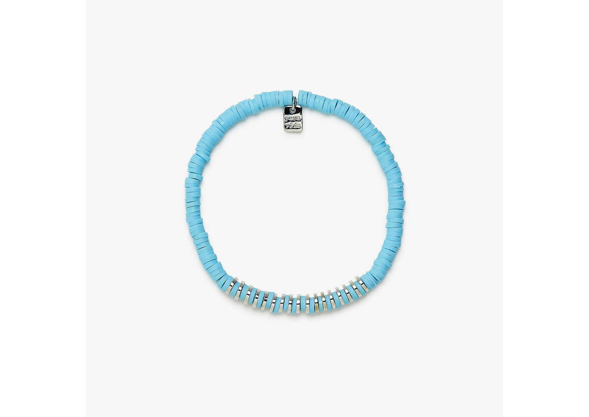 A bracelet that encompasses brilliant balance with multi-faceted style applications. The durable center cord connects a clever pattern of beachy heishi beads, available in both blue/silver and aqua/gold.