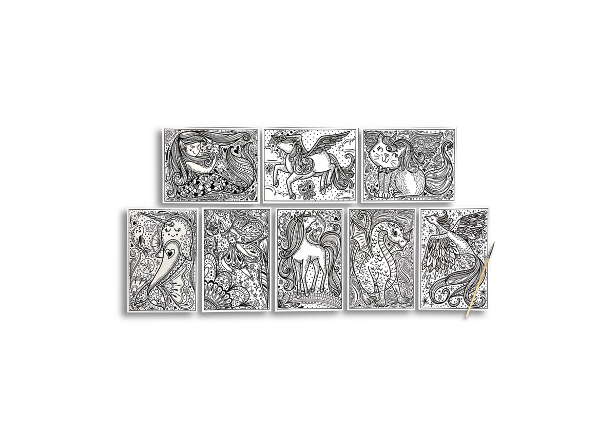 Are you ready to reveal an unforgettable circle of magical pals? These magic painting sheets only need water to go from a black and white illustration to a colorful, lively work of art! The kit includes a paint brush and eight reveal sheets featuring different fantastical pals - all you need to provide is the water!
