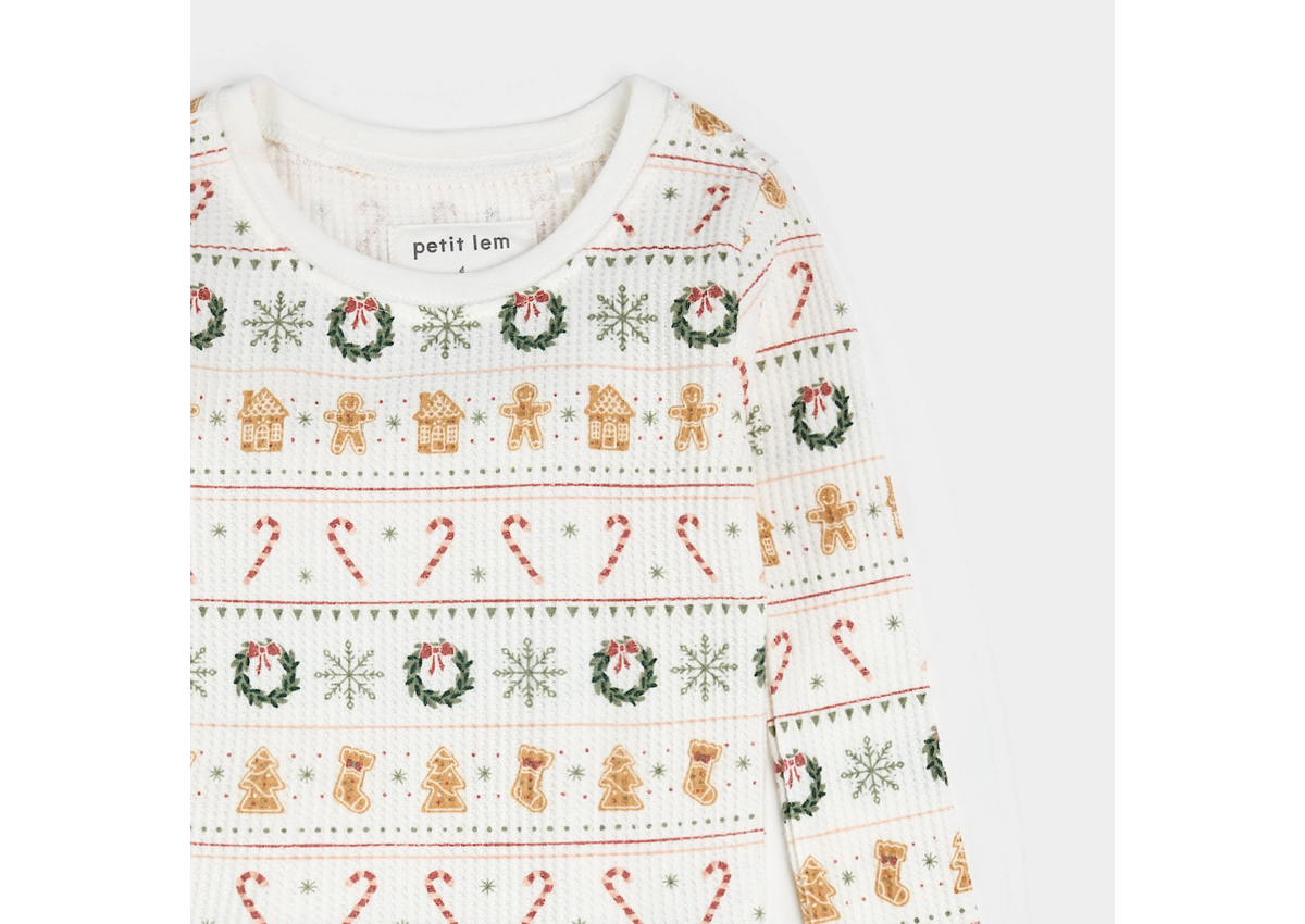 Festive, cozy, and full of charm! This Fair Isle PJ set features candy canes, gingerbread men, and all the sweet holiday treats. The soft thermal blend keeps them warm on colder nights, while the ribbed cuffs and ankles provide a snug fit. Matching sleepers for younger siblings make it easy to capture the wholesome family photos as they play together.