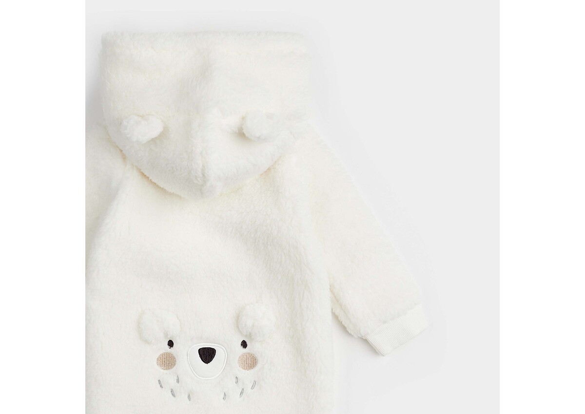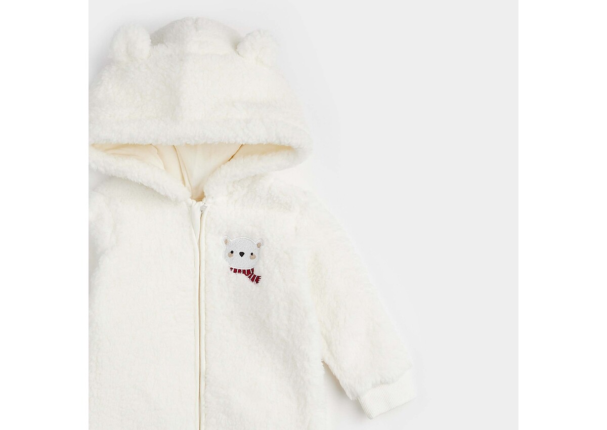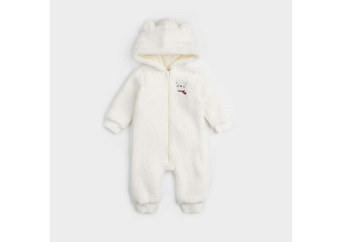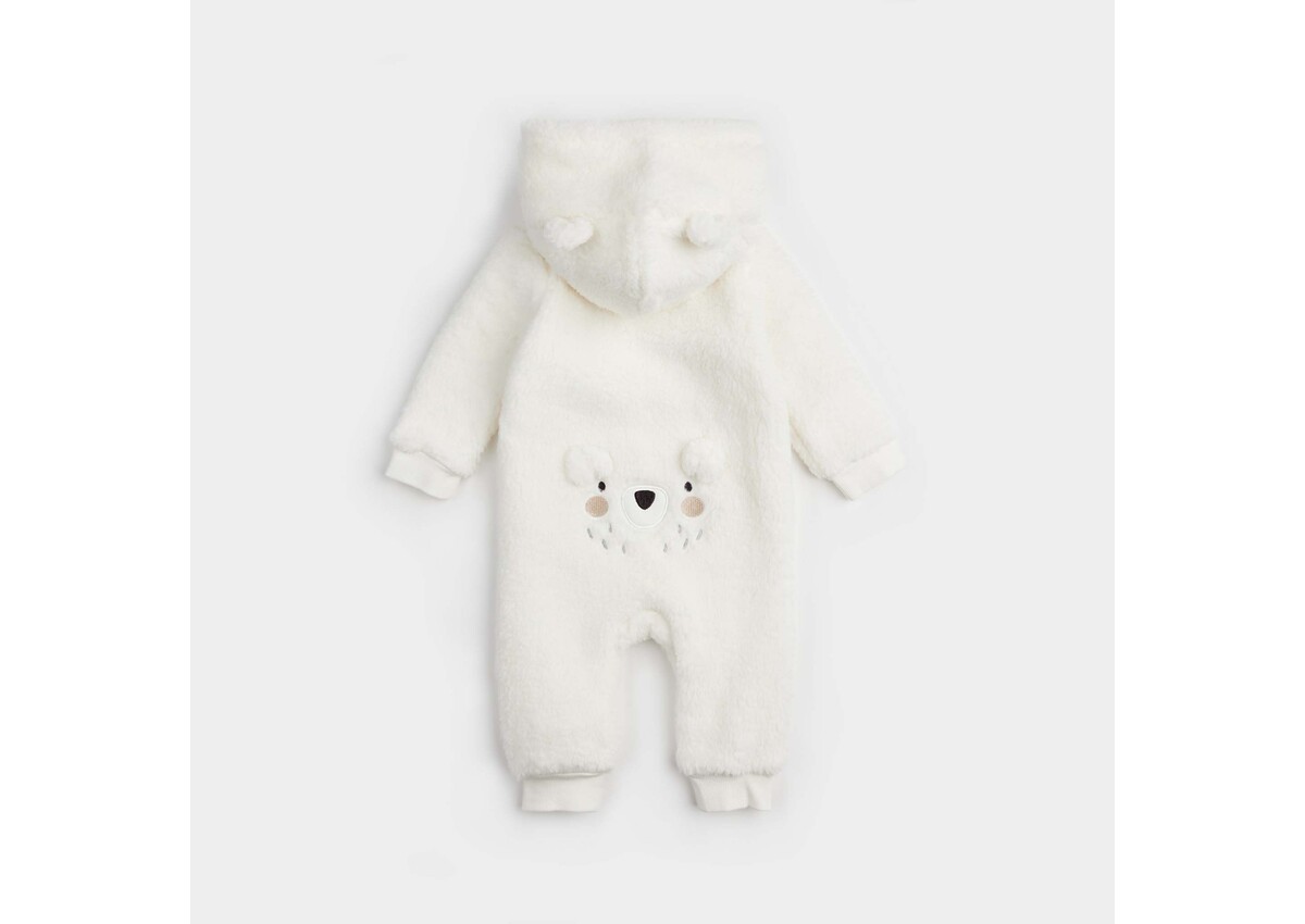 This adorable sherpa playsuit will have your little one all wrapped up while out and about in the cold. With bear ears on the hood, and a polar bear face on the back nothing could be cuter! The sherpa one piece is ultra cozy and is fitted with elasticated cuffs and ankles to keep out the cold. A full-length zipper on the front makes for easy changing while out and about.