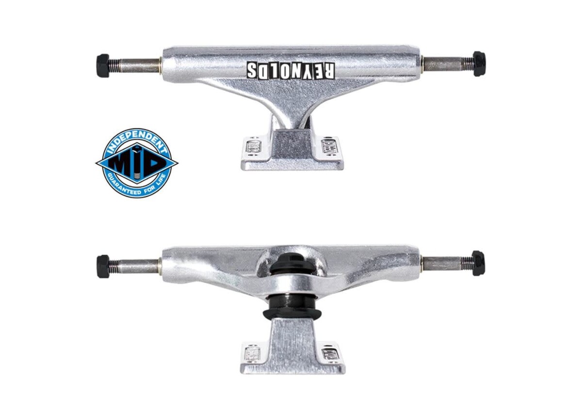 Independent Andrew Reynolds Mid MiD Hollow trucks. New Independent MiD trucks feature a lower profile hanger for optimal contact point angle on your nose and tail for flip tricks, ledges, and all-around street skating with a recommended wheel size of 53mm and under. The newly designed and first ever Independent inverted kingpin can be used with either a 5.5mm Allen key or standard 9/16” hex wrench. The innovative new Shaft Nut in the baseplate creates a rigid and durable solution to lateral movement found in most inverted kingpin designs and increases adjustability. The new MiD is 52mm tall and built on Independent’s legendary geometry with full size cushions for maximum turning action and comes in 129, 139, 144, 149, 159 sizes. The all new design includes a new baseplate stamp and size designations underneath the hanger for easy identification. 52mm tall 356 Aluminum hanger and baseplate 4140 Chromoly steel axle Inverted Grade 8 kingpin w/ 9/16” & 5.5mm All