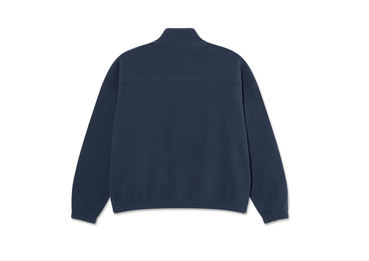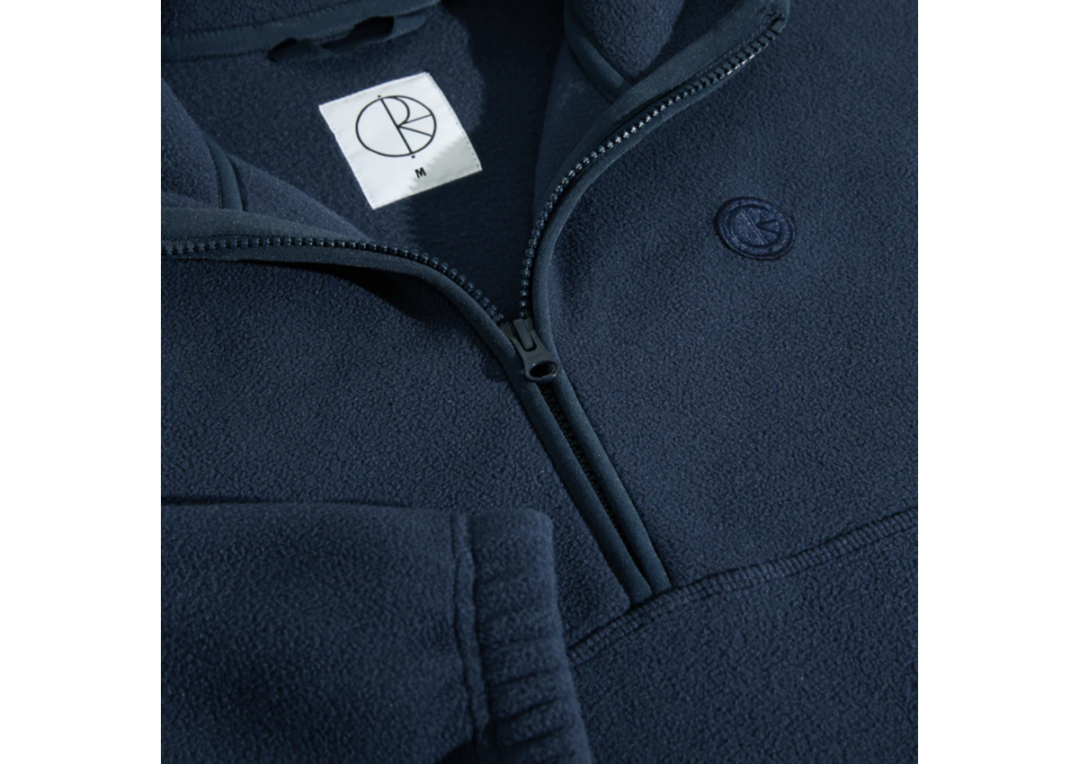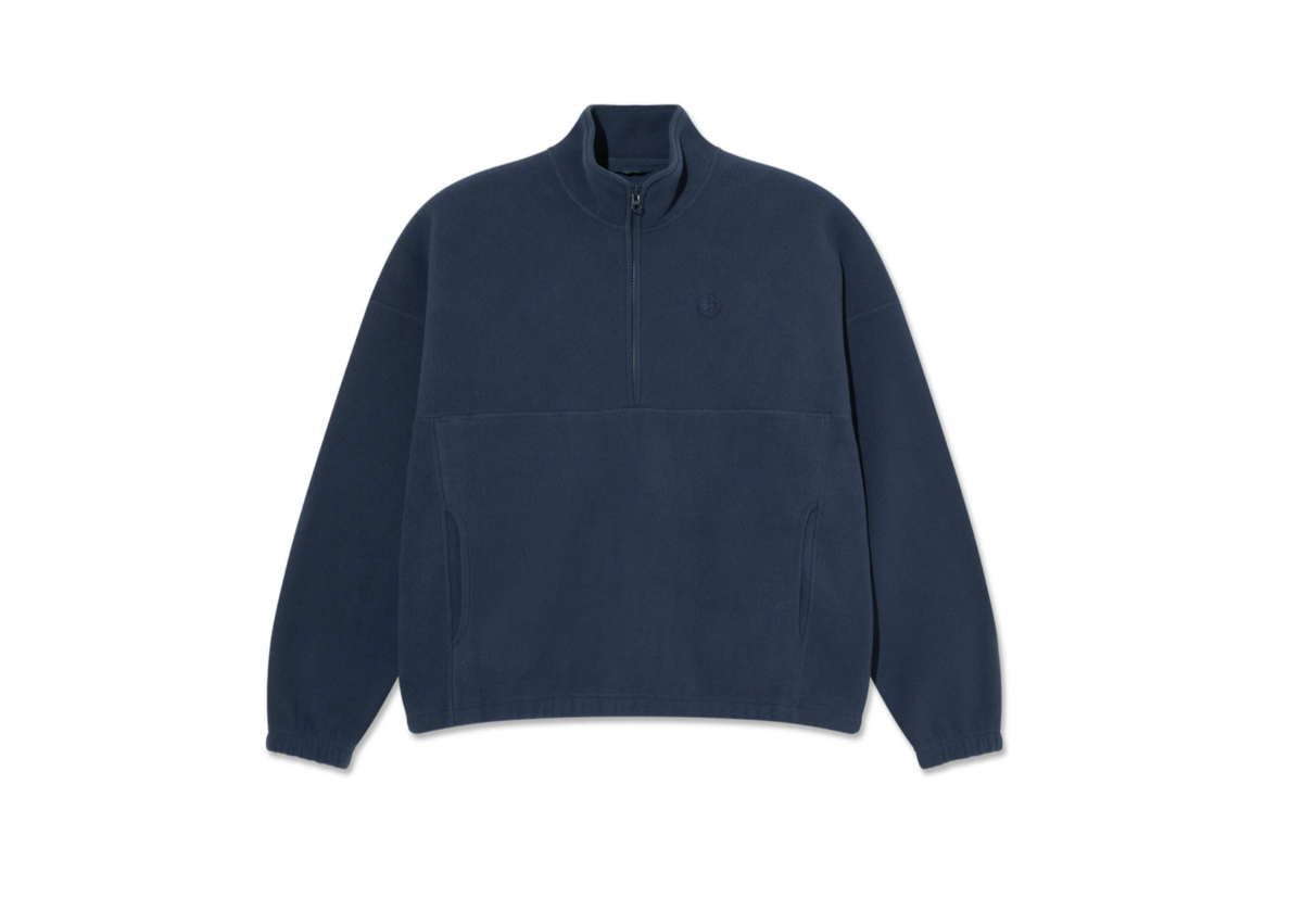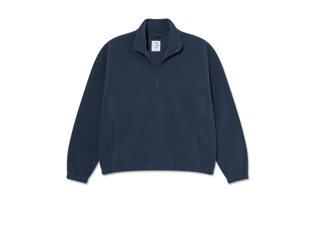 Relaxed T-shape fleece in double-brushed polyester with a soft, napped finish. Dropped shoulders and a half-zip stand collar define the silhouette. Curved zip pockets, elastic cuffs, and hem add subtle structure. Finished with YKK zippers, reflecting string pullers, and an embroidered patch logo.