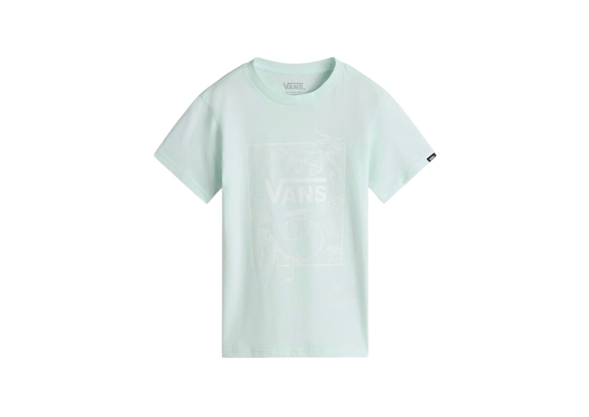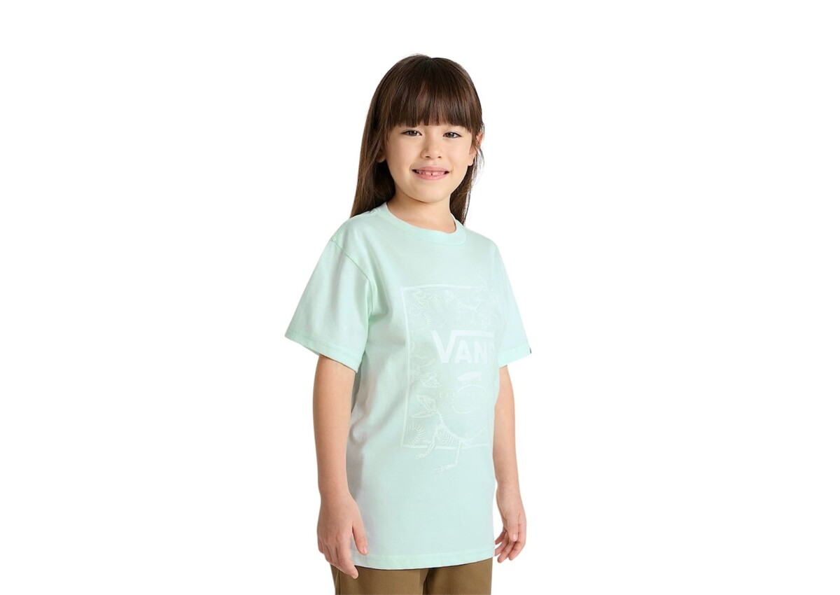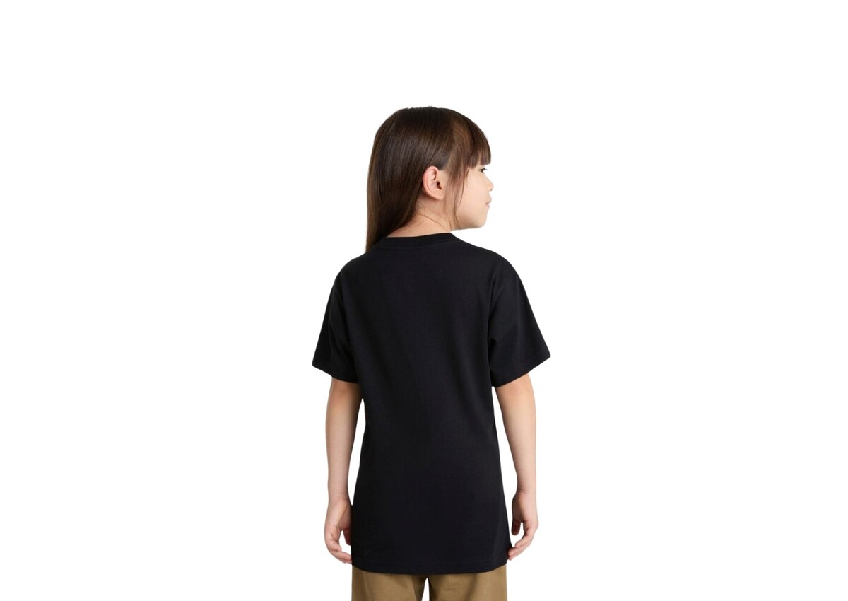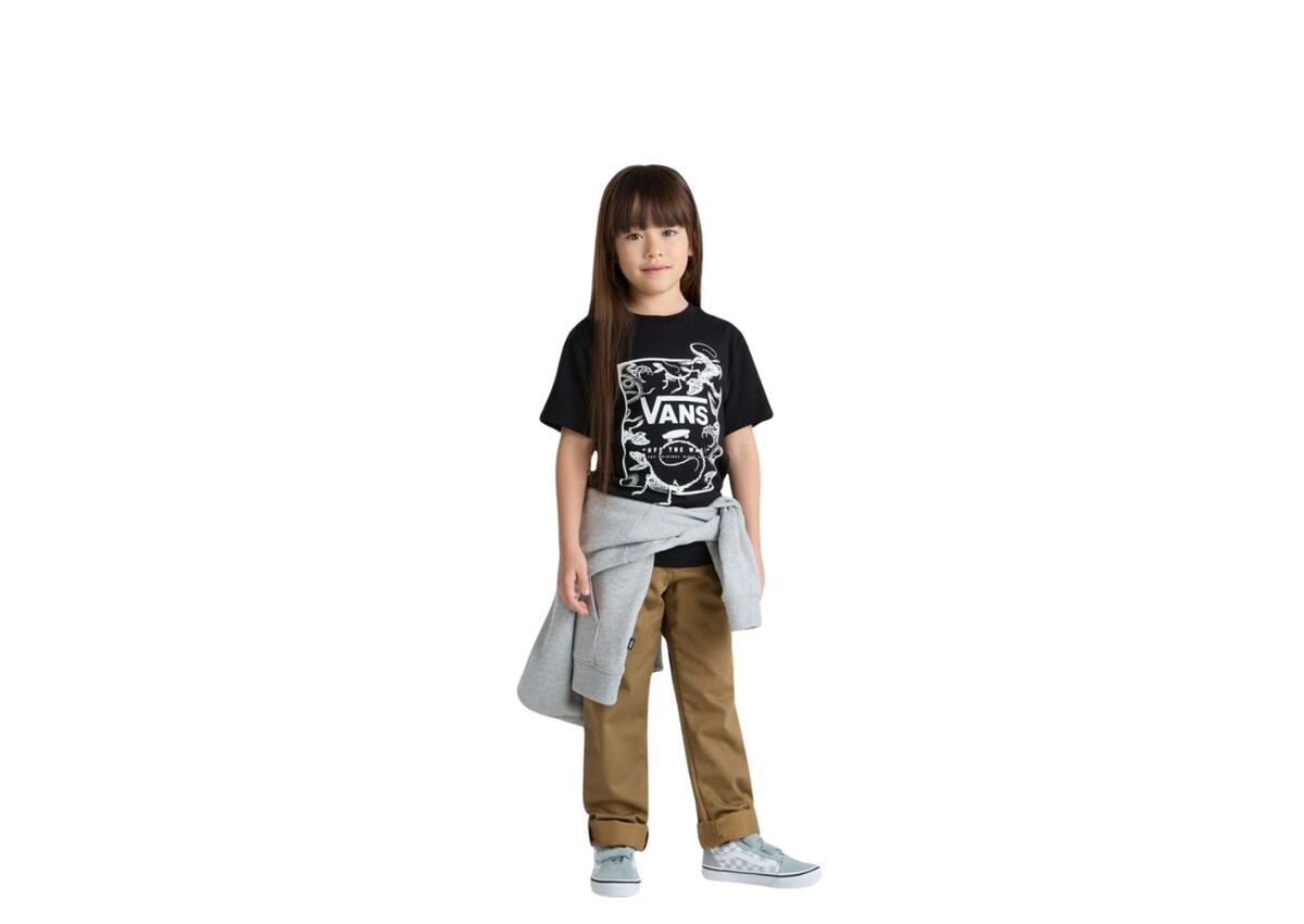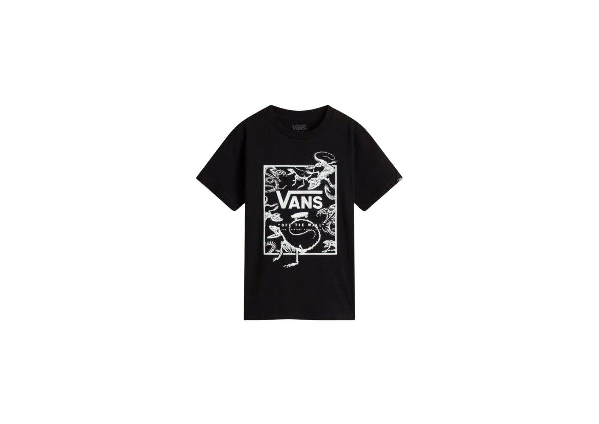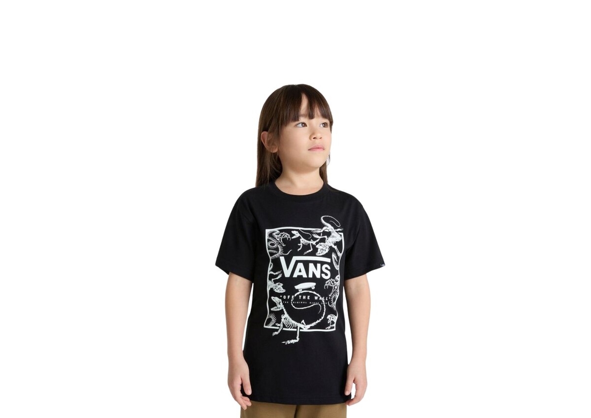 Kids’ Dino T-shirt in black with a round neckline and short sleeves made of cotton, features a Vans logo printed on the front along with fun dinosaur skeleton graphics that exude classic Vans attitude.