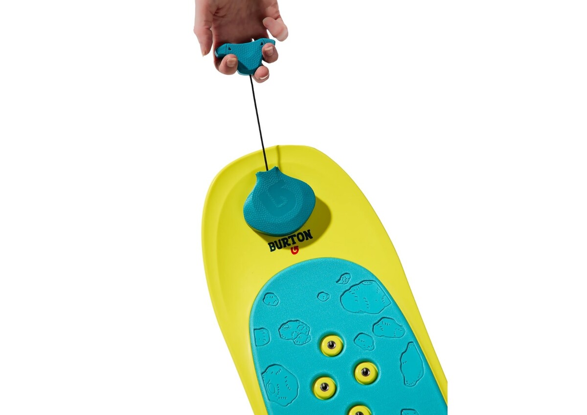 Snow, carpet, or even grass, the kids' Burton Riglet Snowboard lets you bring the learning experience home from the mountain, year-round! With a built-in Riglet reel, safe and forgiving edgeless construction, and a grippy top, kids can quickly jump on and develop basic skills at home while you pull them across any low-friction surface. Inserts make it easy to add bindings when it's time to take the next step.
