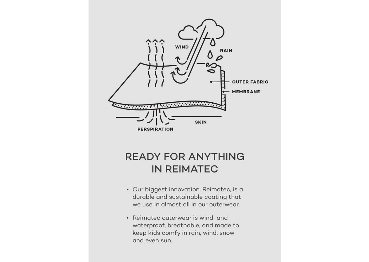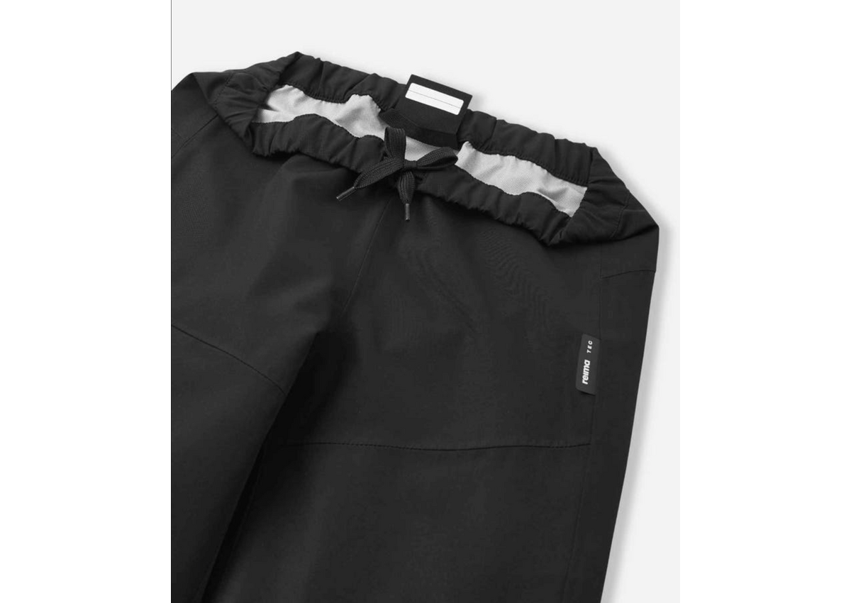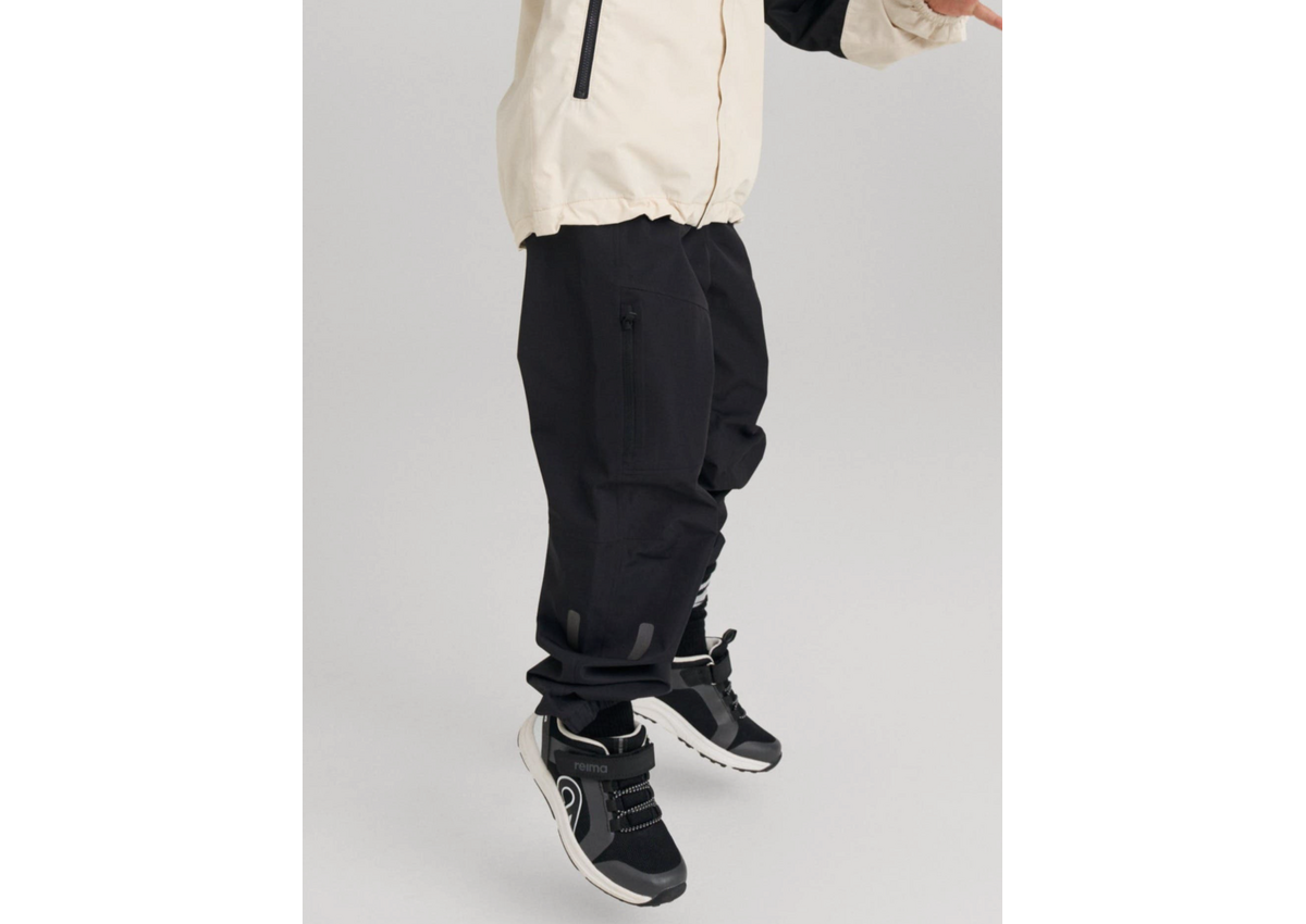 These very light waterproof outdoor pants keep your kid dry during outdoor play. The fully sealed seams and waterproof fabric protect against rain and mud while the shaped cut allows for maximum movement. There is no lining, but because the fabric is very smooth inside, these shell pants are easy to dress on top of other pants or leggings. An elastic waist and leg ends provide a comfortable fit that adjusts as they grow. A zip pocket safely stores small essentials. When playtime is over, just wipe clean or wash and tumble dry for next-day adventures. These ReimaTec waterproof pants are an excellent choice for juniors who spend a lot of time outside, in all weather.