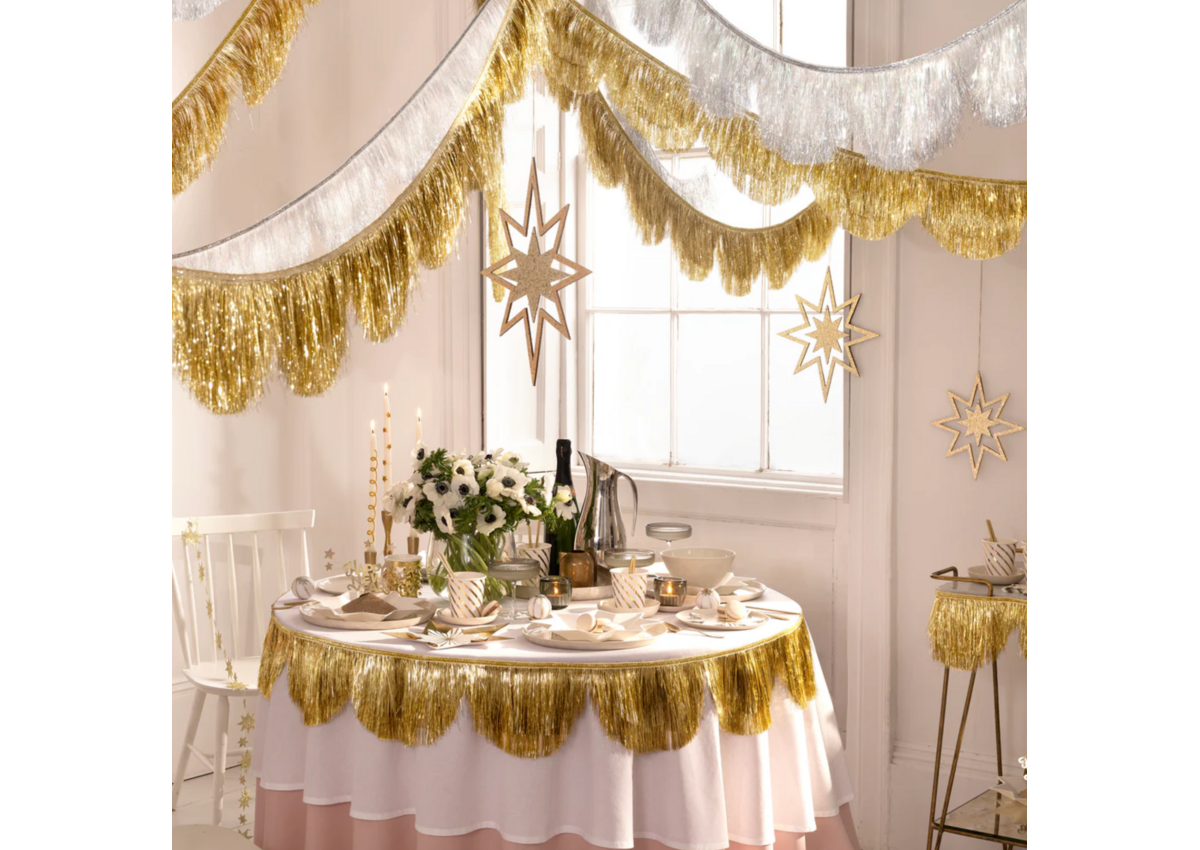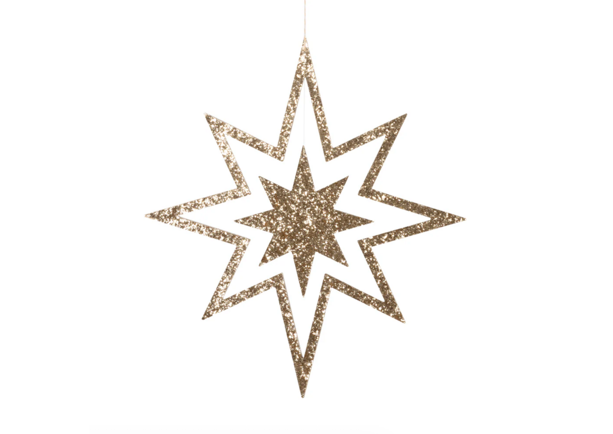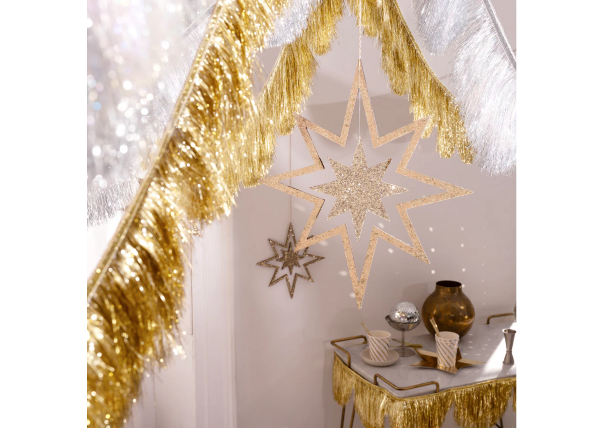 Make your holiday decor shine with these dazzling wooden stars. Coated in chunky gold glitter, this set includes three different sizes, each with a smaller dangling inner star for an eye-catching effect. Hang them together in a window or porch, where a soft breeze will set them gently spinning, or style them throughout your home to spread festive cheer. Reusable, simply pack them away after the celebrations are over and bring them out year after year for an effortless statement look.