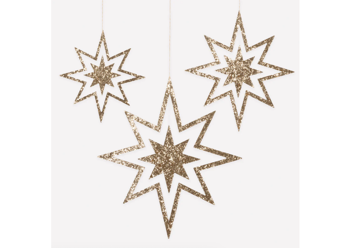 Make your holiday decor shine with these dazzling wooden stars. Coated in chunky gold glitter, this set includes three different sizes, each with a smaller dangling inner star for an eye-catching effect.