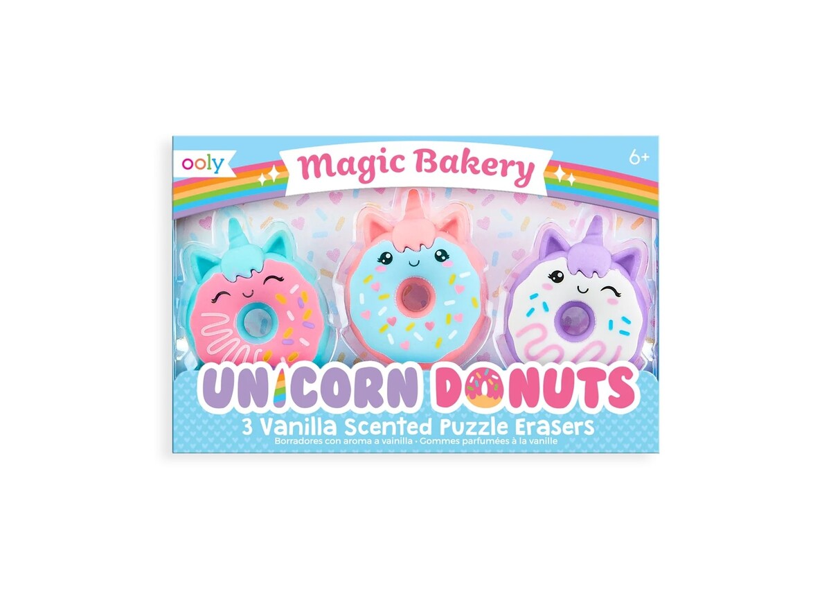 Mistakes become moments of joy with the Magic Bakery Unicorn Donuts vanilla scented erasers. These puzzle erasers let you swap the donut tops letting you mix and match the smiling donuts to suit your mood! Pair these erasers with any OOLY graphite or colored pencil set. Plus with three erasers in the pack you can have one for school, one for home, and one spare too!