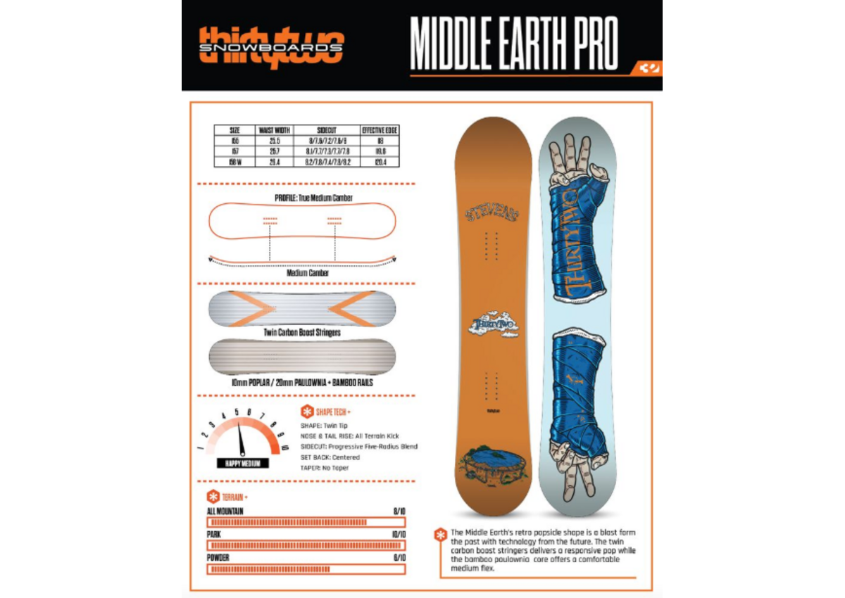 The Middle Earth’s retro popsicle shape is a blast form the past with technology from the future. The twin carbon boost stringers delivers a responsive pop while the bamboo paulownia core offers a comfortable medium flex.