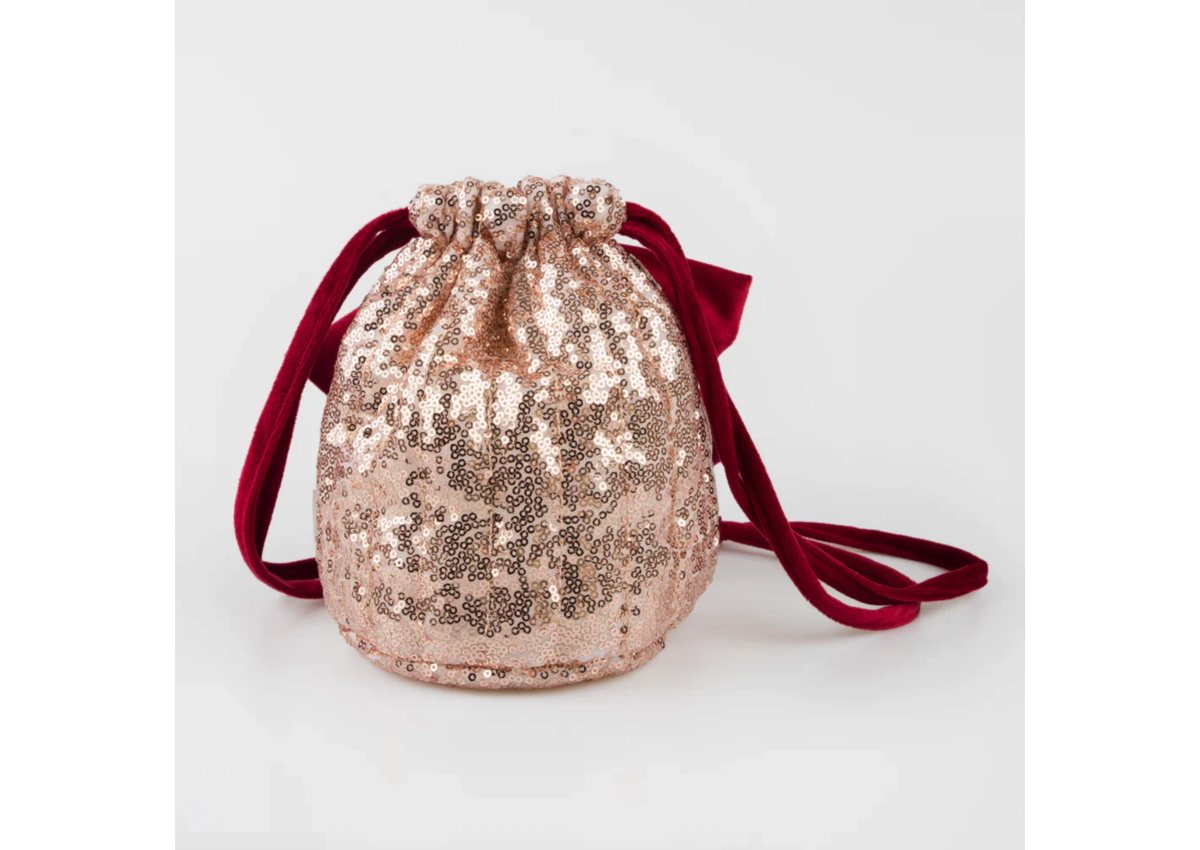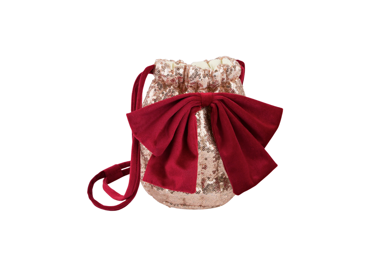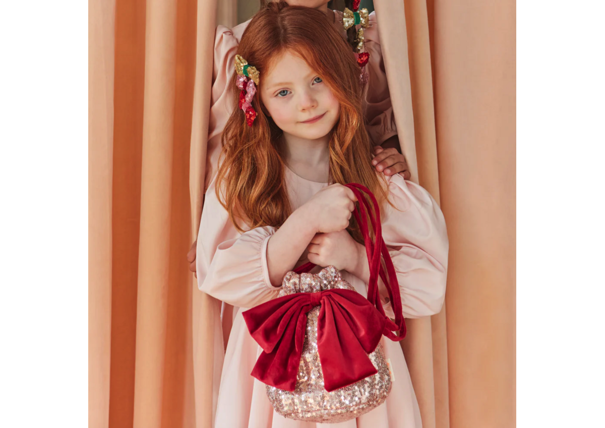 Sequins and bows – simply the most pretty statement Christmas combination ever! This beautiful bag, with a sumptuous rich berry red velvet bow and glitzy quilted sequinned dusky pink tulle fabric, will make any outfit look super special. A fabulous gift for kids, or adults, who love amazing accessories.