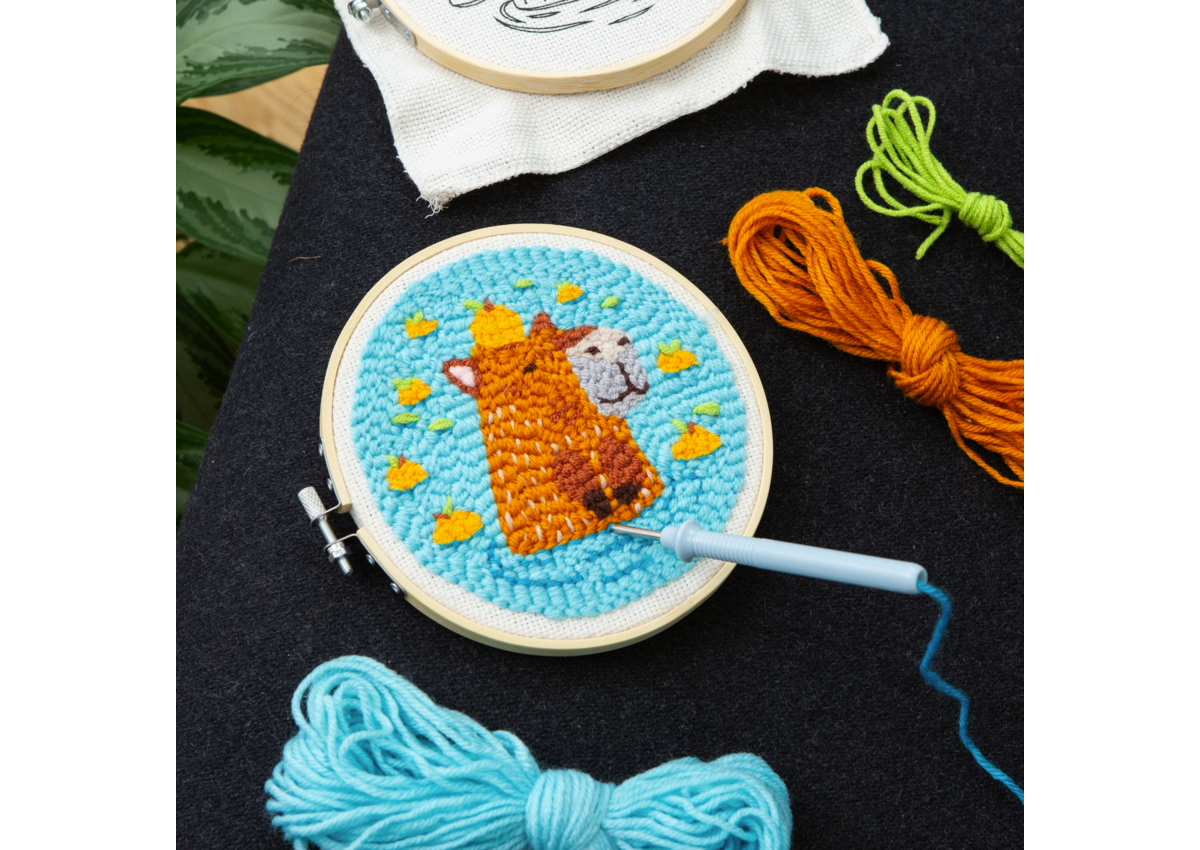 Learn the traditional handicraft of punch needle or "rug hooking" and create your very own miniature landscape tapestry. Kit comes with everything needed including: 1 adjustable bamboo hoop, 1 punch needle, 1 needle threader, 1 cotton cloth with printed template, and plenty of yarn to complete the design. Great for beginners!