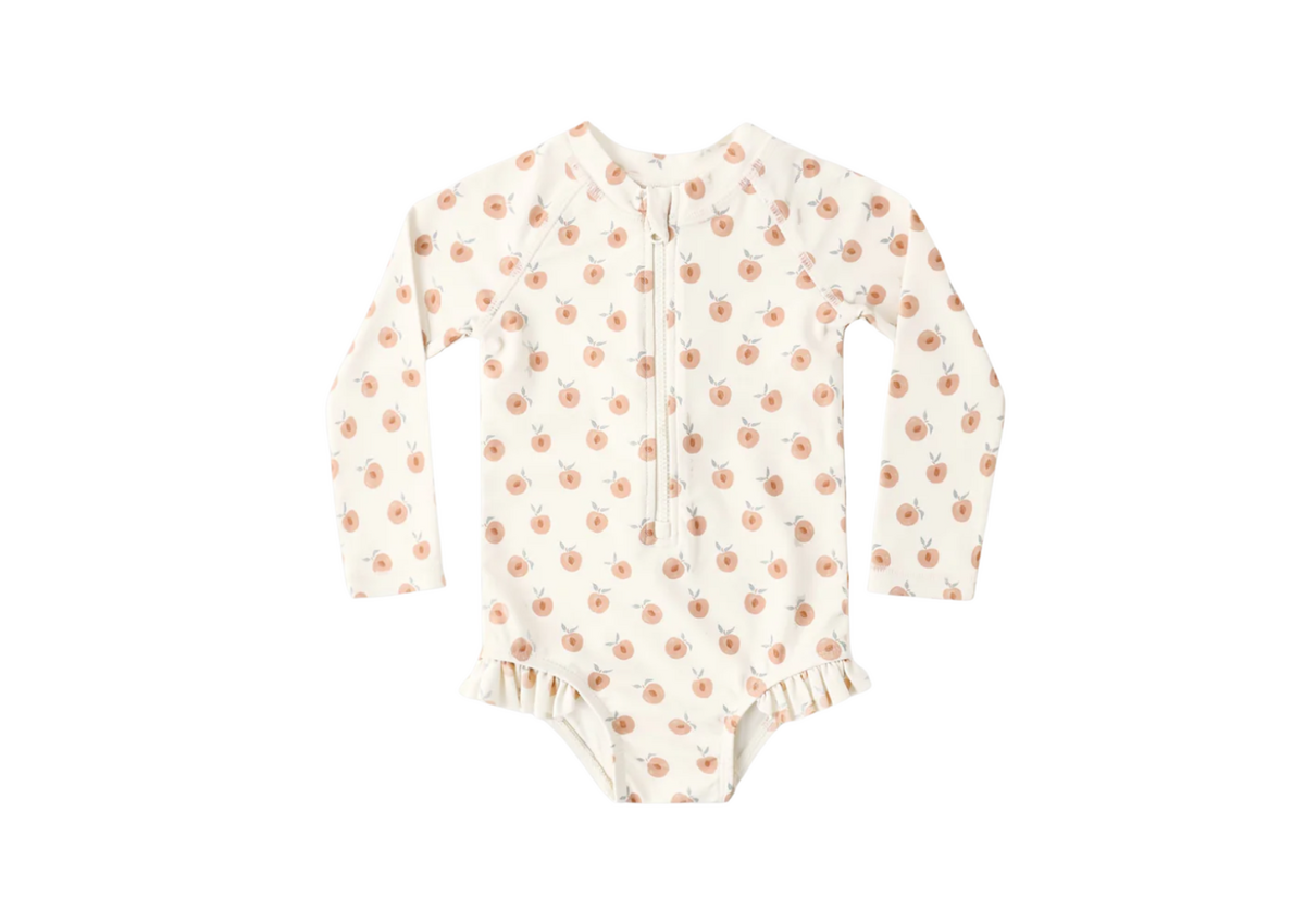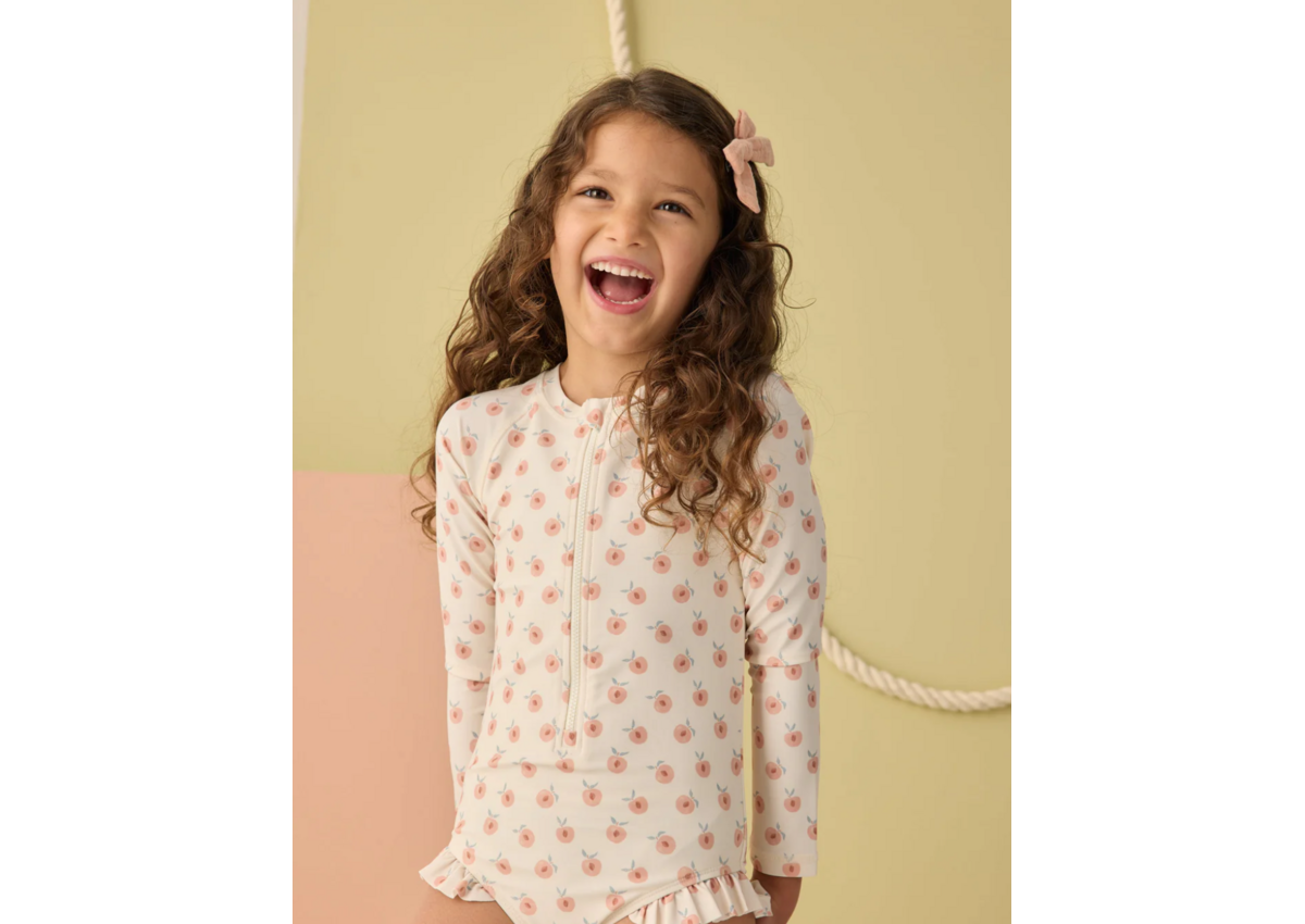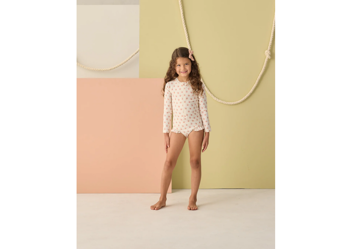 Long sleeves, ruffled bottoms, zip front, and a silky liner make this rash guard one-piece a summer must-have.