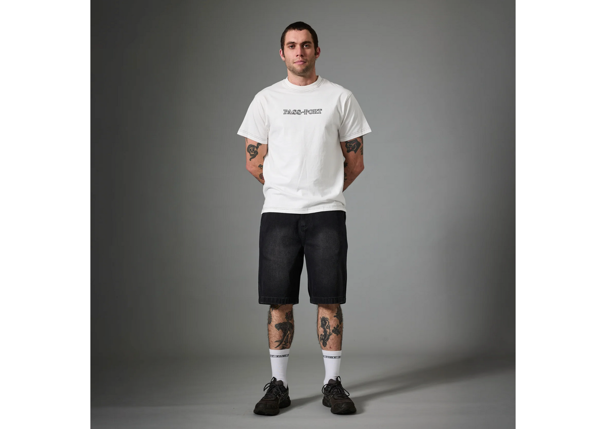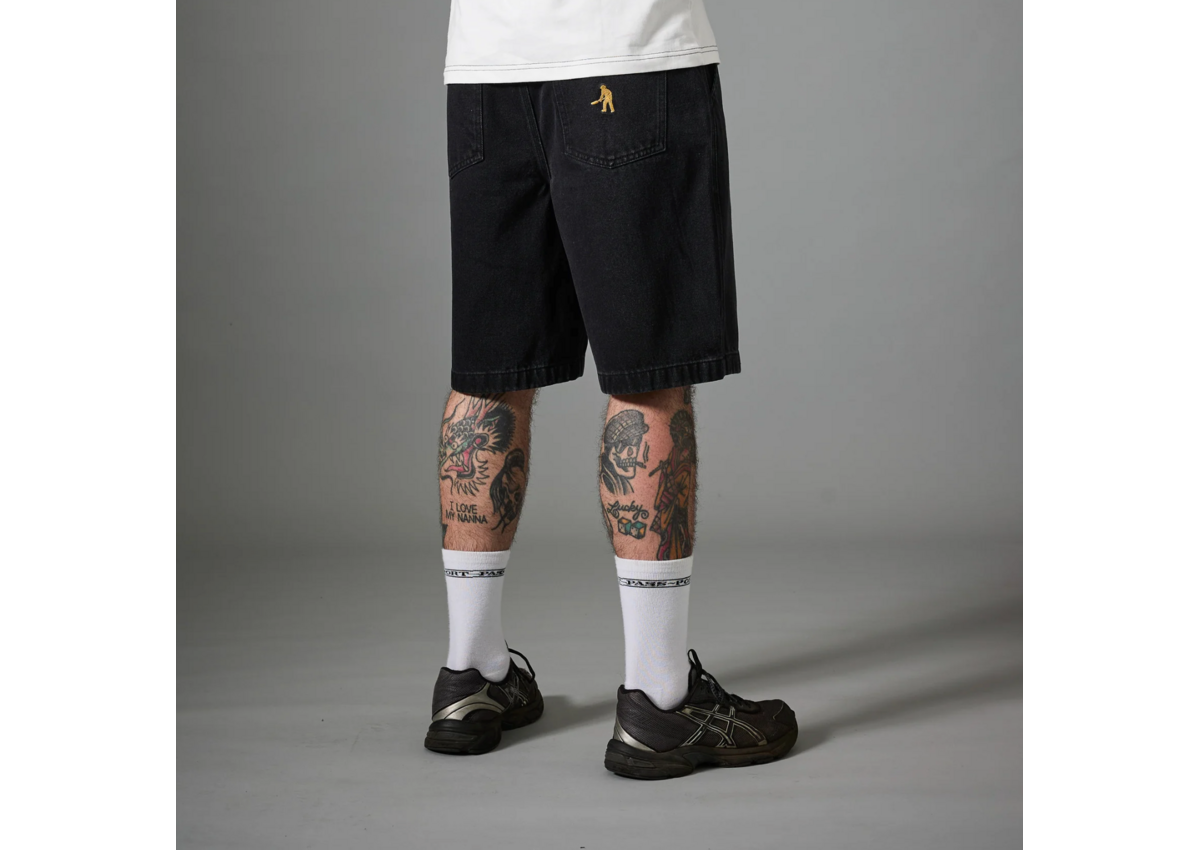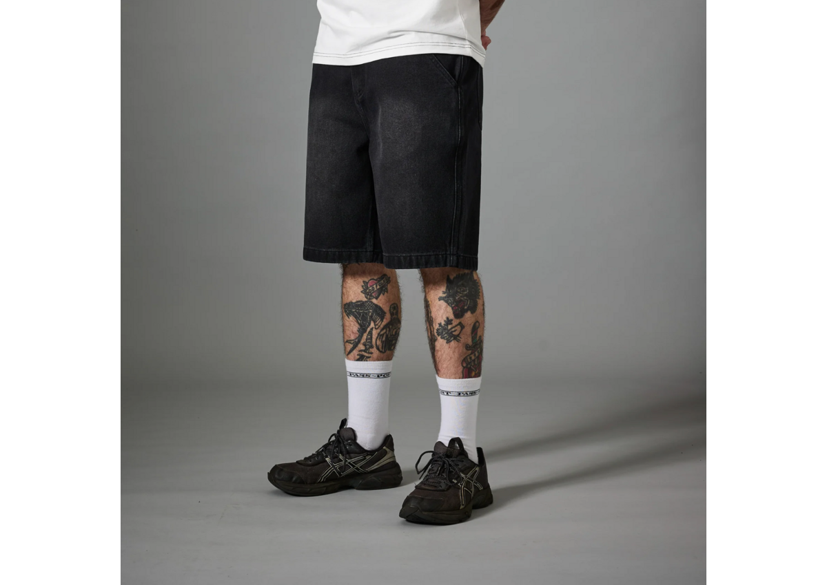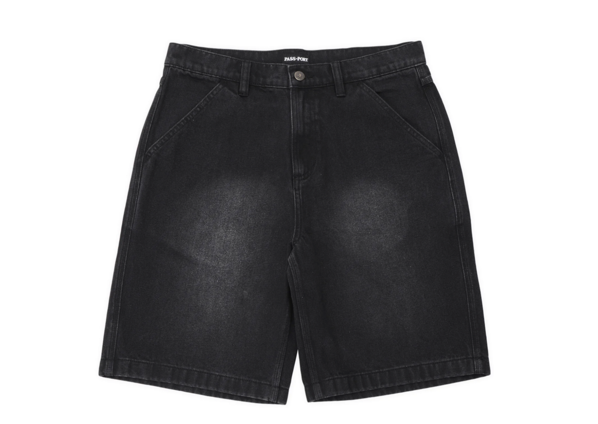 Pass~Port Recycled Cotton Workers Club Jean Short from range #44. The Recycled Cotton Workers Jean Short is made from 20% Recycled Cotton 80% Cotton 16oz rigid denim. The denim short features a digger embroidery on back pocket as well a faux leather label on waist.