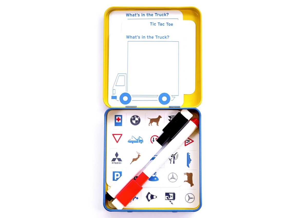Put the top down and car into gear — Keep your fellow travelers entertained when you're on the road with this travel kit. All the games are reusable. Contains Hangman, Tic Tac Toe, What's in the Truck and Car Bingo. 8 cards, dry erase pen and instructions included.