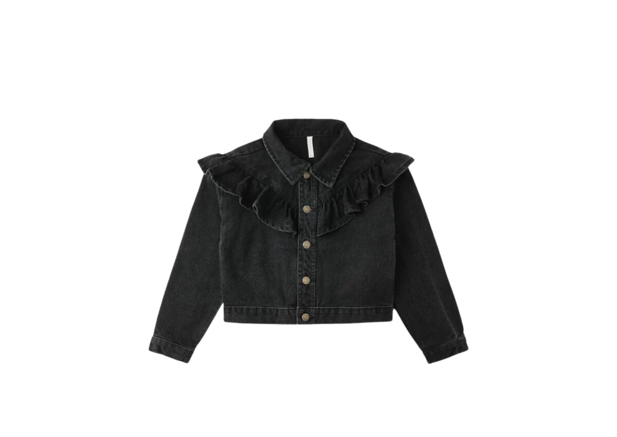 This denim jacket is a fun layering piece, featuring a front ruffle for a touch of Western flair.