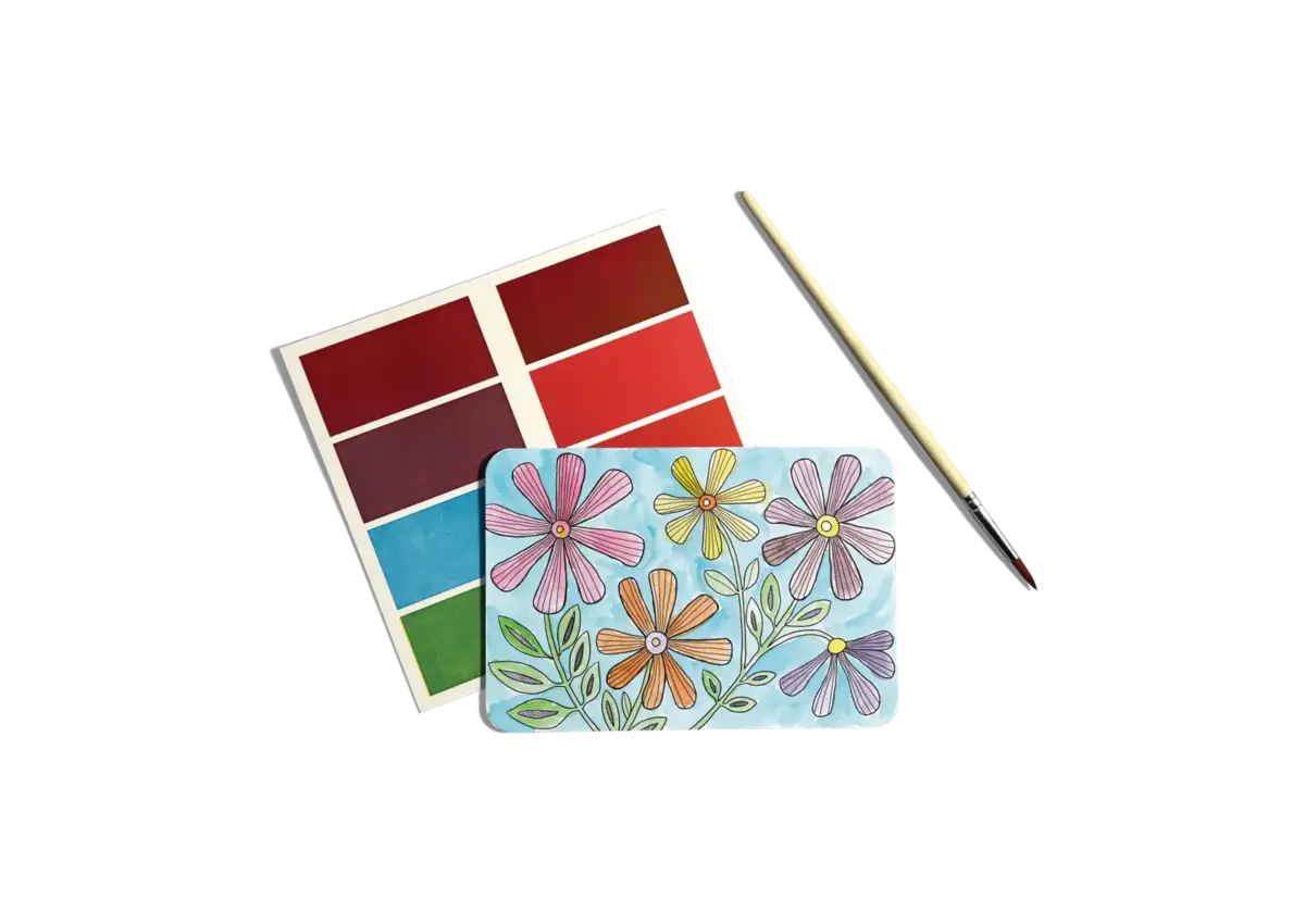 - Kit includes 8 different watercolor postcards, 8 paint palettes, 1 paint brush, and a color guide