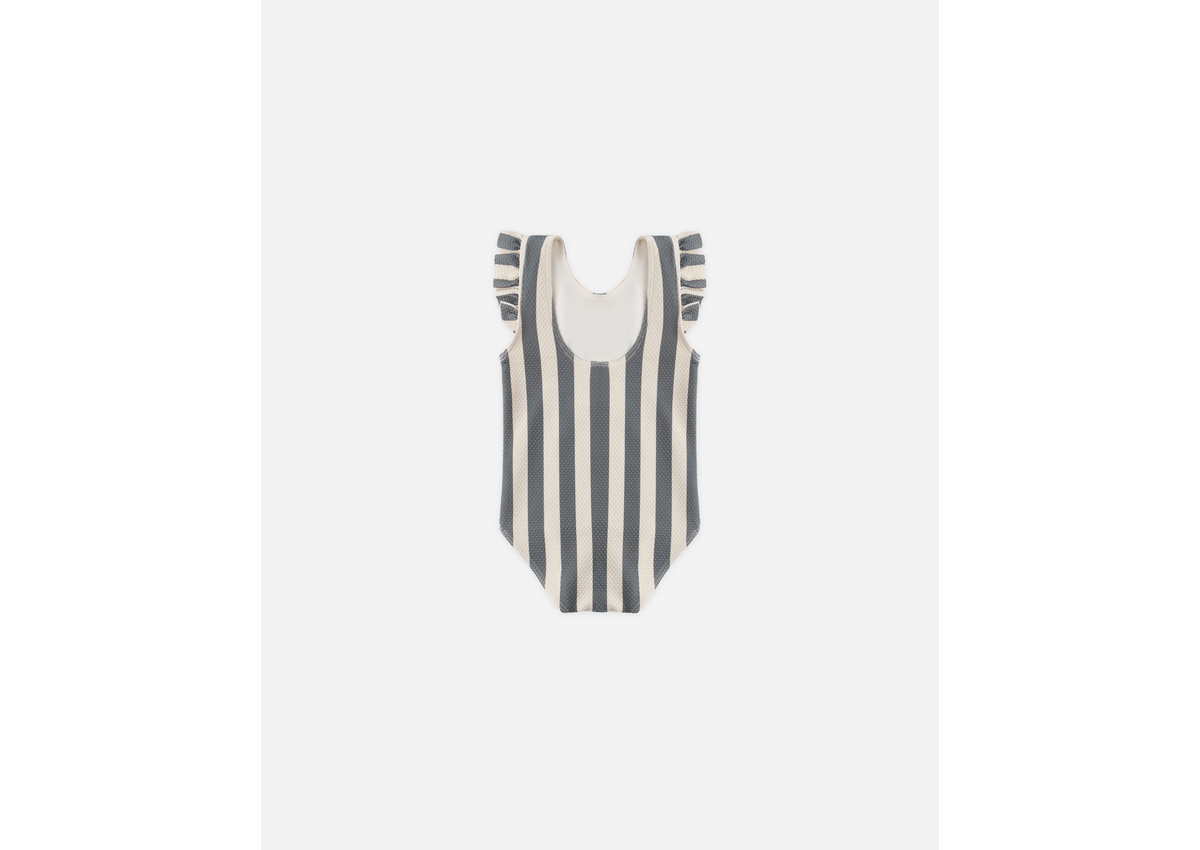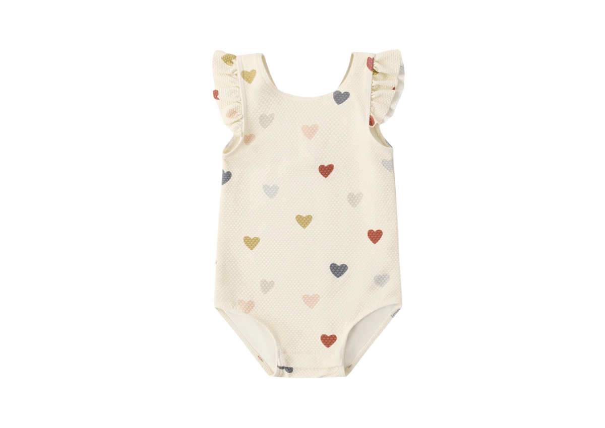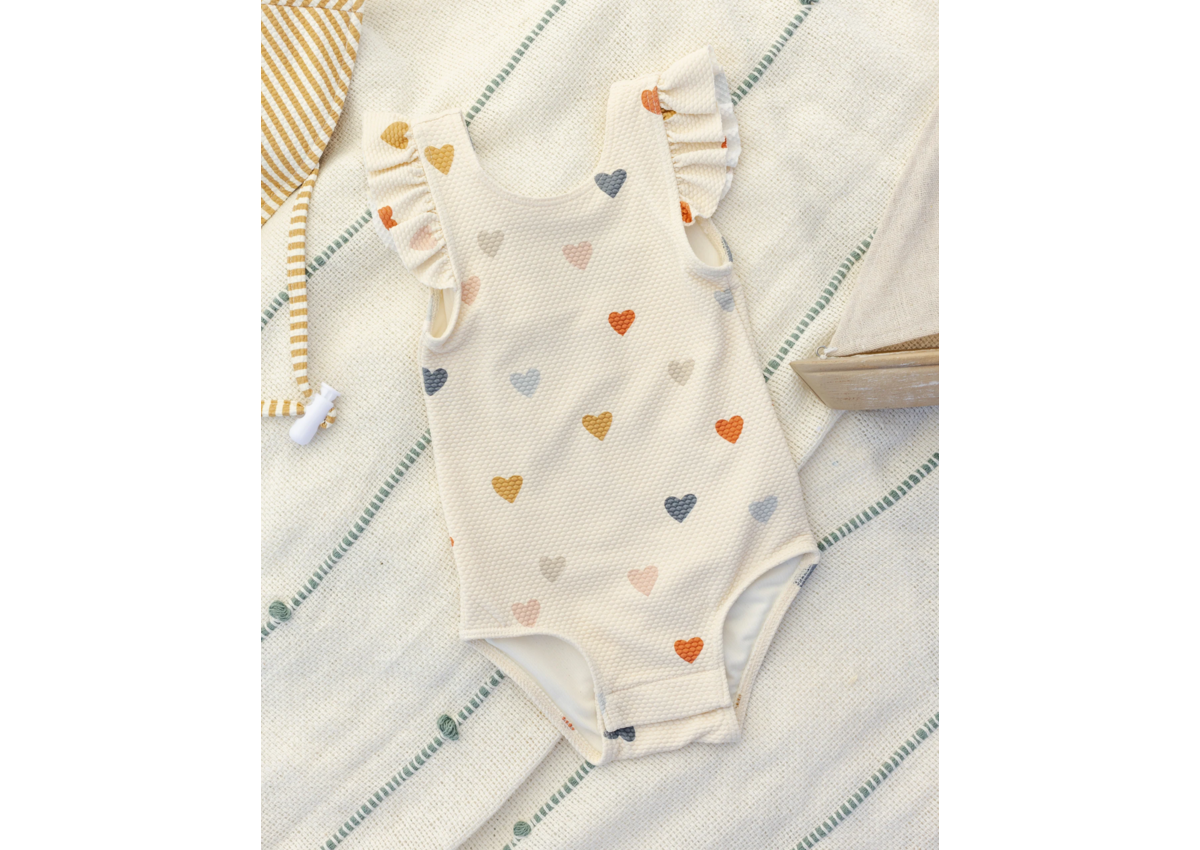 This darling one-piece swimsuit features a scoop neck and back and fun flutter sleeves.