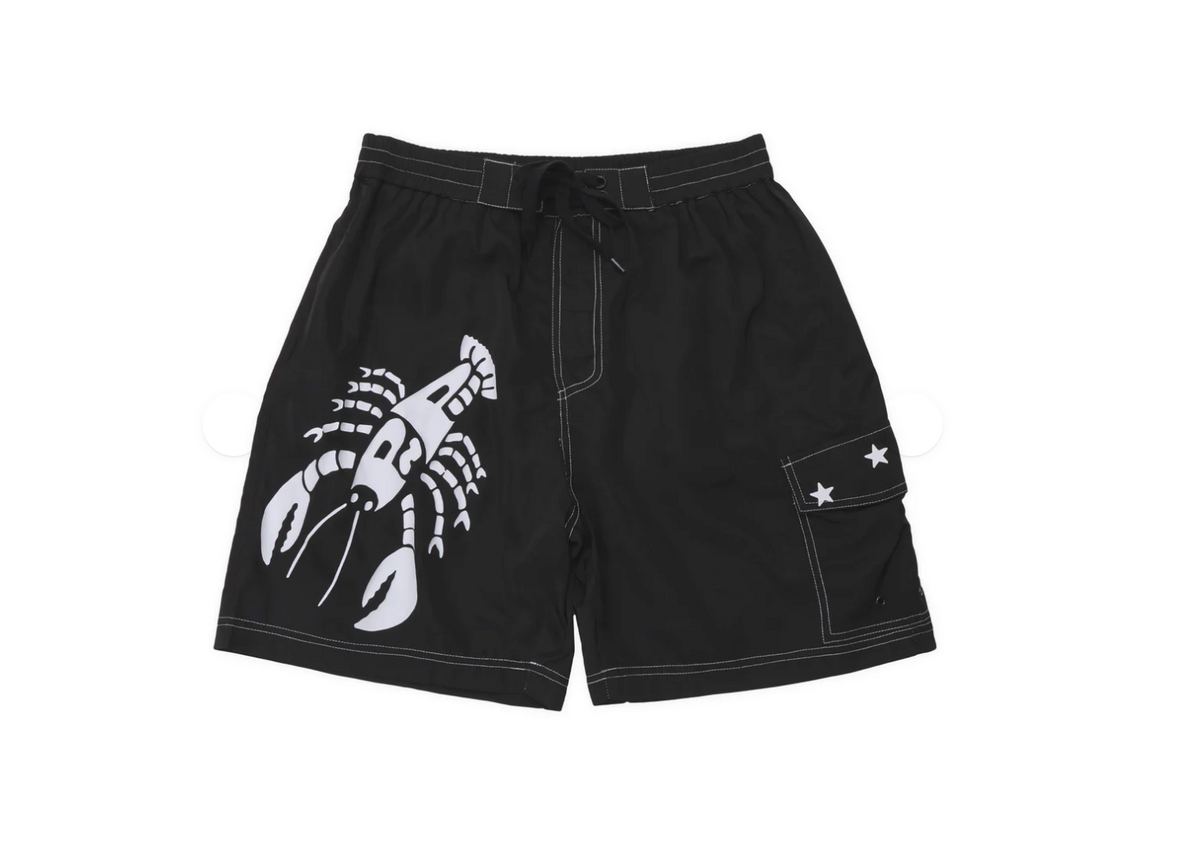 Introducing the Pass~Port Seafood Staff Boardshorts in Black from range #46. The boardshort is made from 100% polyester and features a screen print design, a single cargo pocket and an elastic waistband with drawstring fasteners.