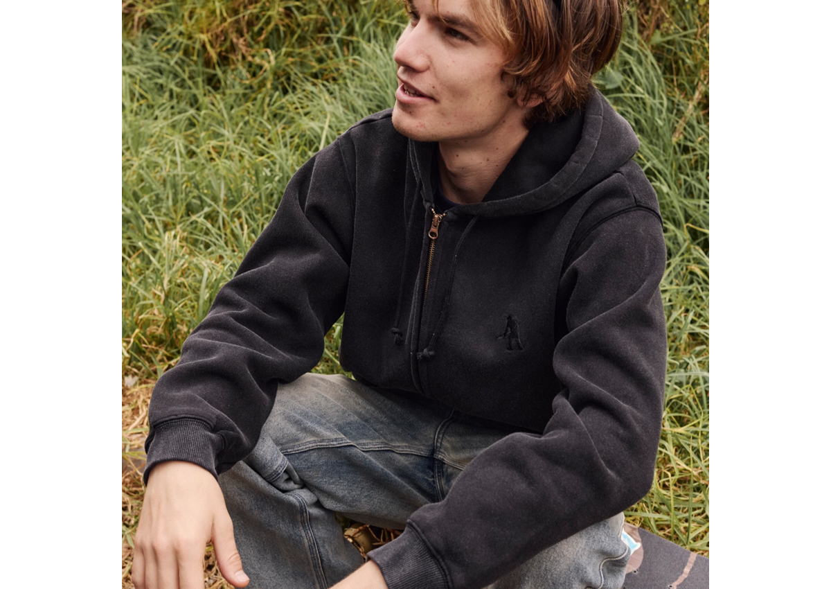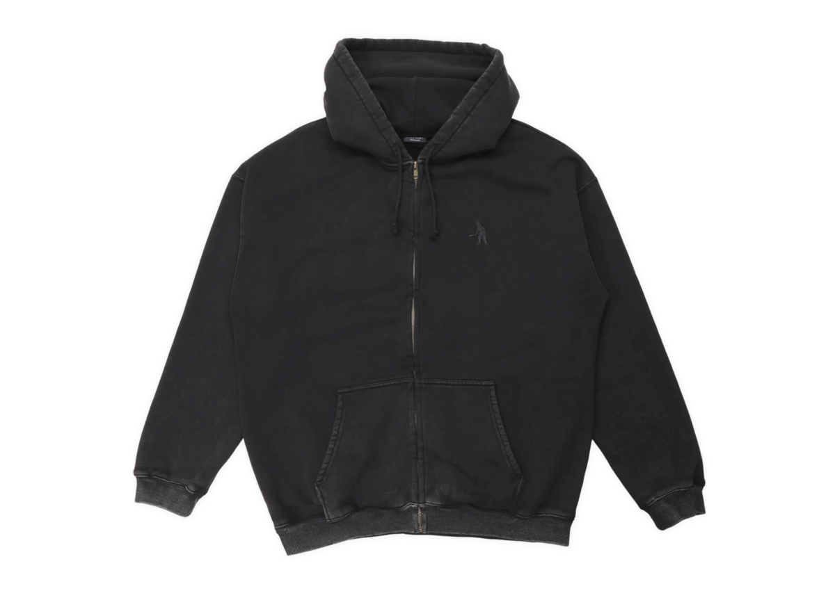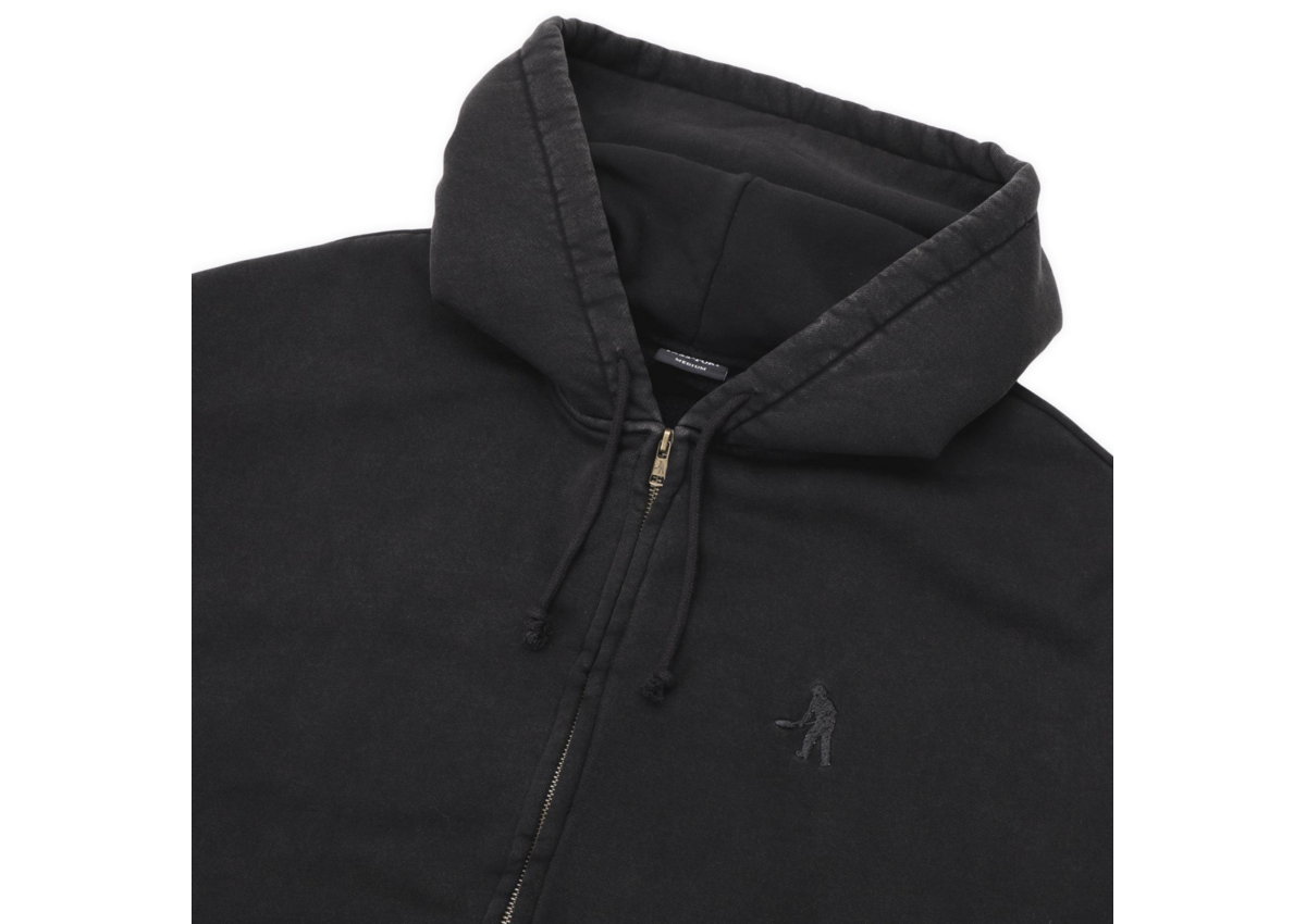Pass~Port Solid Workers Zip hood in Washed Black from range #46. Made from 380GSM Cotton Poly Blend. The Solid Workers Hoodie features a digger embroidery on chest and drawstring hood. Finished in a heavy weight fleece with an oversized boxy fit.