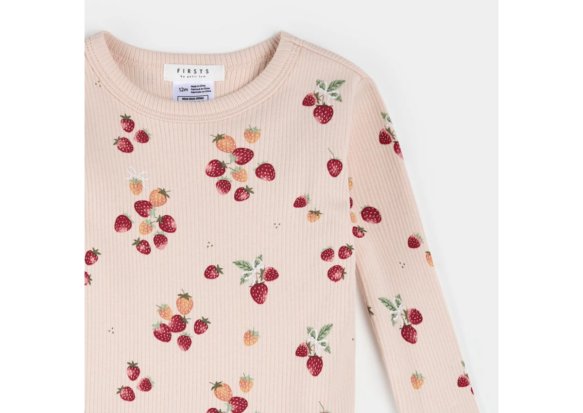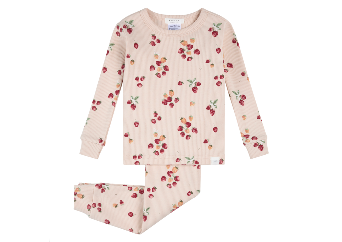 Designed for cozy cuddles, wiggles and giggles, this organically grown cotton rib PJ set is perfect for summer dreamers. With long sleeves and long pants, the set keeps her at just the right temperature through sleep and play while the stretchy waistband ensures a comfortable fit. With a delightful all-over strawberry print, the PJs coordinate with the sleepwear available from the same range for her sisters – making them look like the freshest little team.