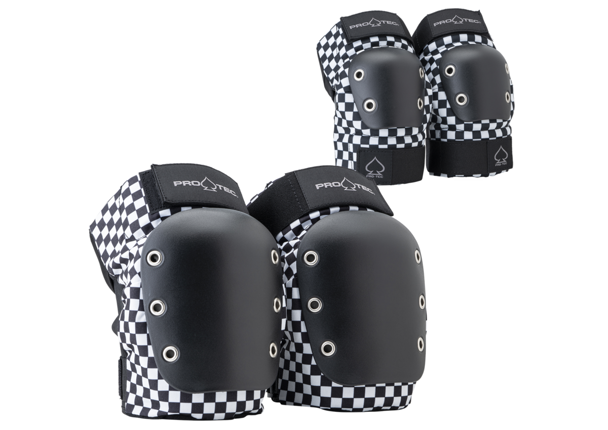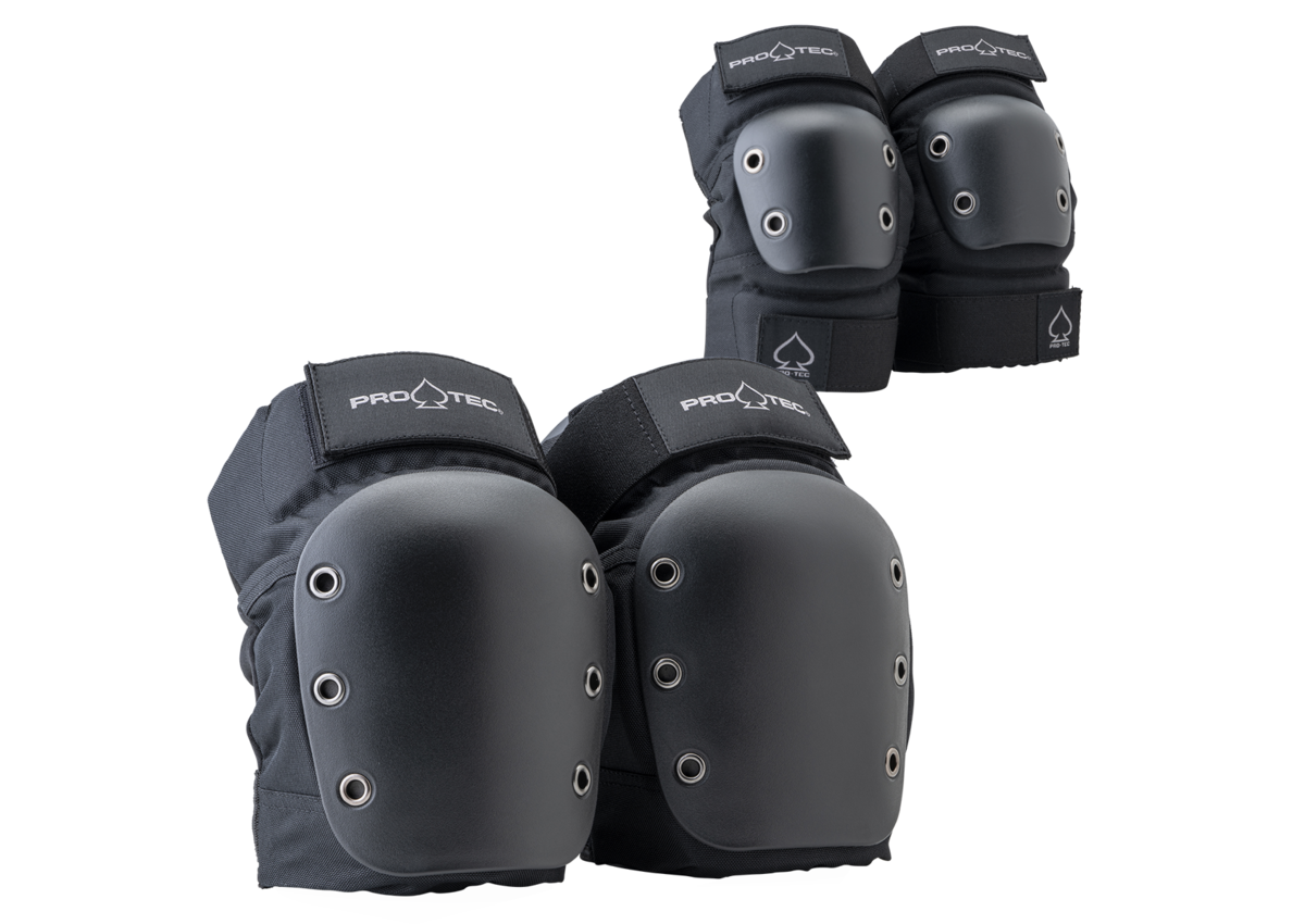 Shred like the pros at the skatepark or on the street with only the best equipment. The Pro-Tec Street Knee and Elbow Pad Set is the standard for action sport protection and the top choice by skaters and cyclists in the industry. Featuring full coverage ABS hard caps and soft EVA cup foam, these pads will absorb and shrug off high impacts and hard slams. Durable lycra and ballistic nylon let the wearer maintain flexibility with a low profile and less bulk while still resisting tears in the fabric. These ergonomic pads are constructed of breathable materials to improve comfort and keep the wearer cool and dry during intense activity. The top and bottom wrap around straps are strong and easily adjustable with the attached hook and loop fasteners, so the pads are never too loose or too tight. Includes 2 knee pads and 2 elbow pads.