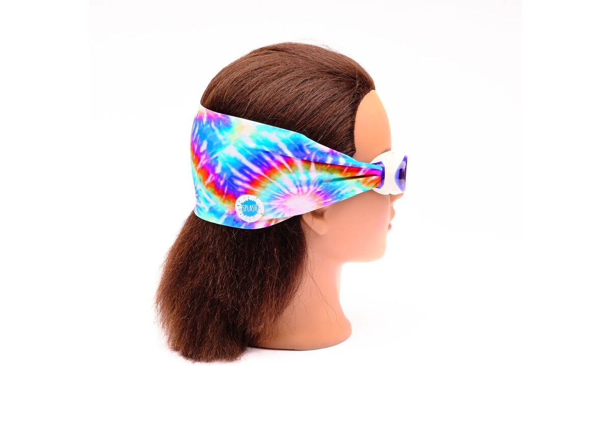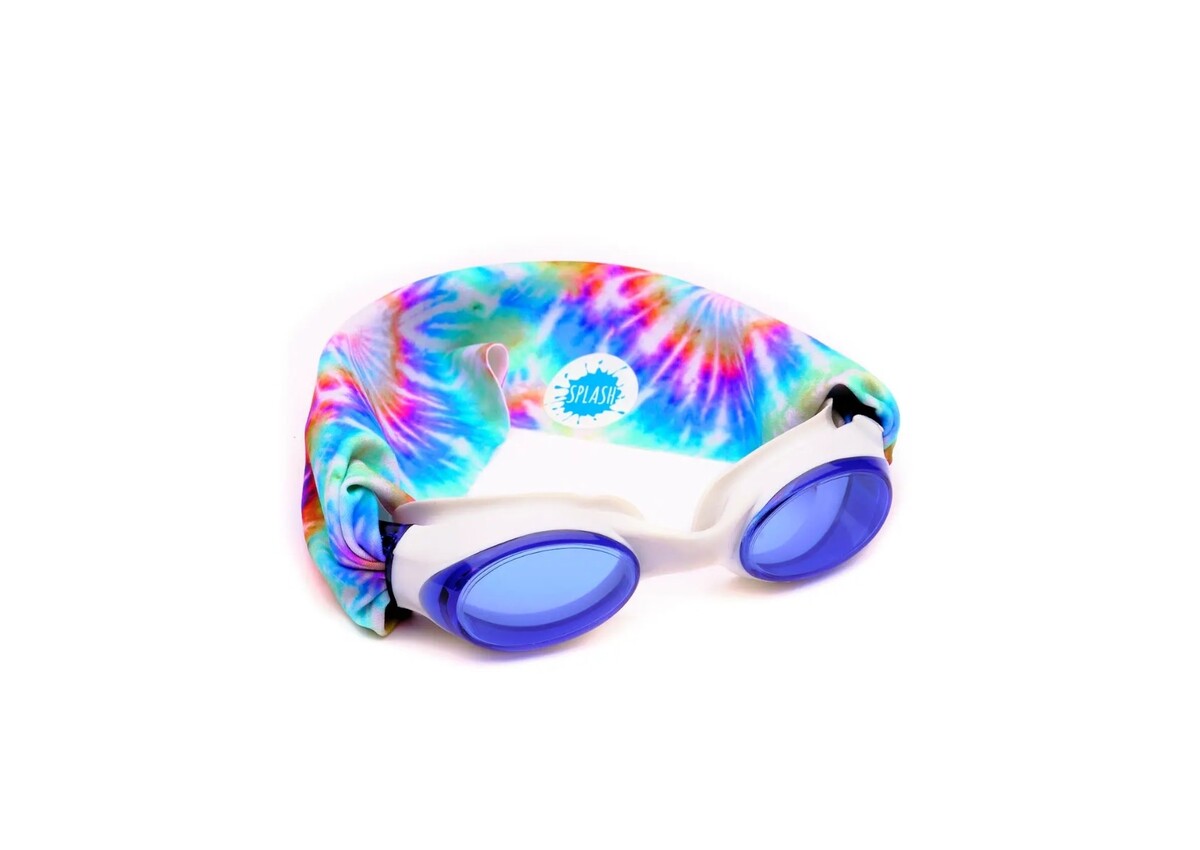 Our Tie Dye swim goggle features our tangle-free, patent-pending strap in tie dye print, paired with a white frame and lightly tinted blue lenses. One size fits kids to adults. Ages 3+. No more pulled or tangled hair. Fun, fashionable, comfortable.