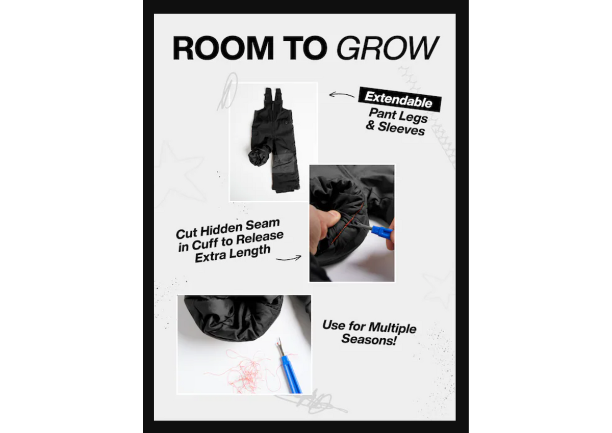 Youth Winter Snow Bib Pants. Insulated, 15k waterproof bibs with Room-to-Grow.