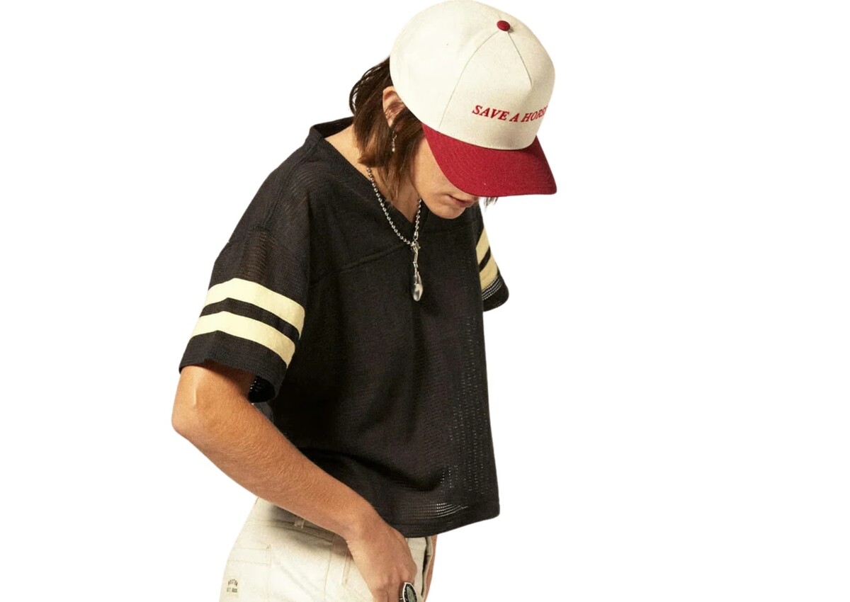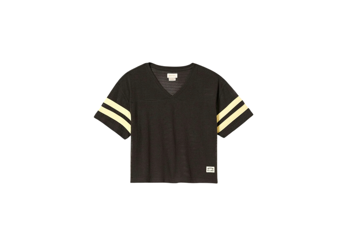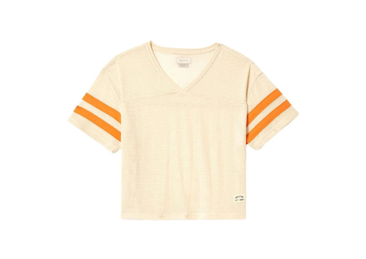 The Varsity Football Mesh T-Shirt is your go-to for effortless sporty style and comfort. This womens tee is made from a breathable cotton-poly mesh for a lightweight feel, ideal for casual days or layering over athletic wear. Striped sleeves channel a retro varsity aesthetic, and the Brixton Woodburn label delivers a touch of branded detailing. Perfect for sunny outings or laid-back weekend looks, this tee combines timeless athletic-inspired details with modern wearability.