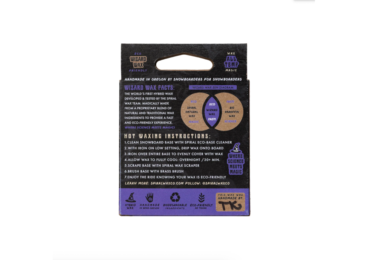 The world's first hybrid wax! Developed & tested by the spiral wax team. Magically made from a proprietary blend of natural and traditional wax ingredients to provide a fast and Eco-friendly experience. Where science meets magic! Wizard Artwork by: Dave Banks