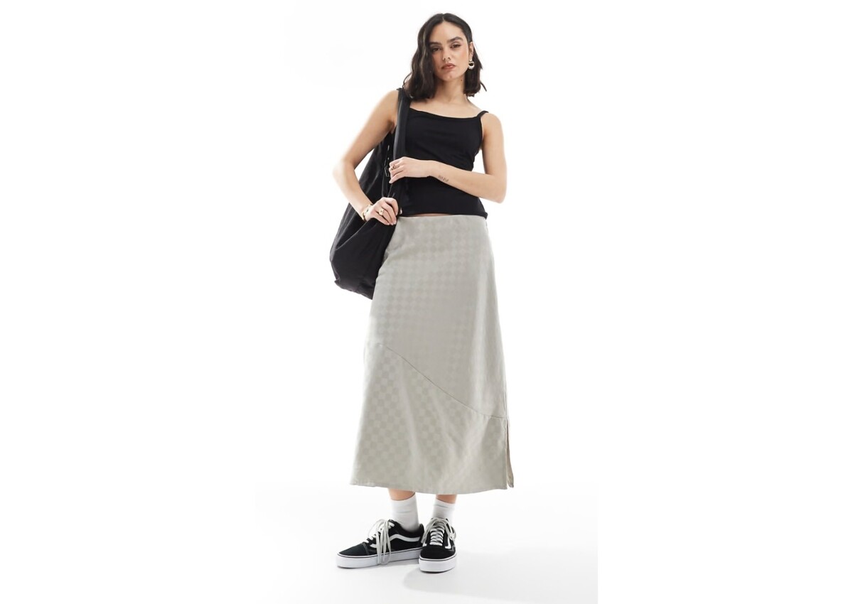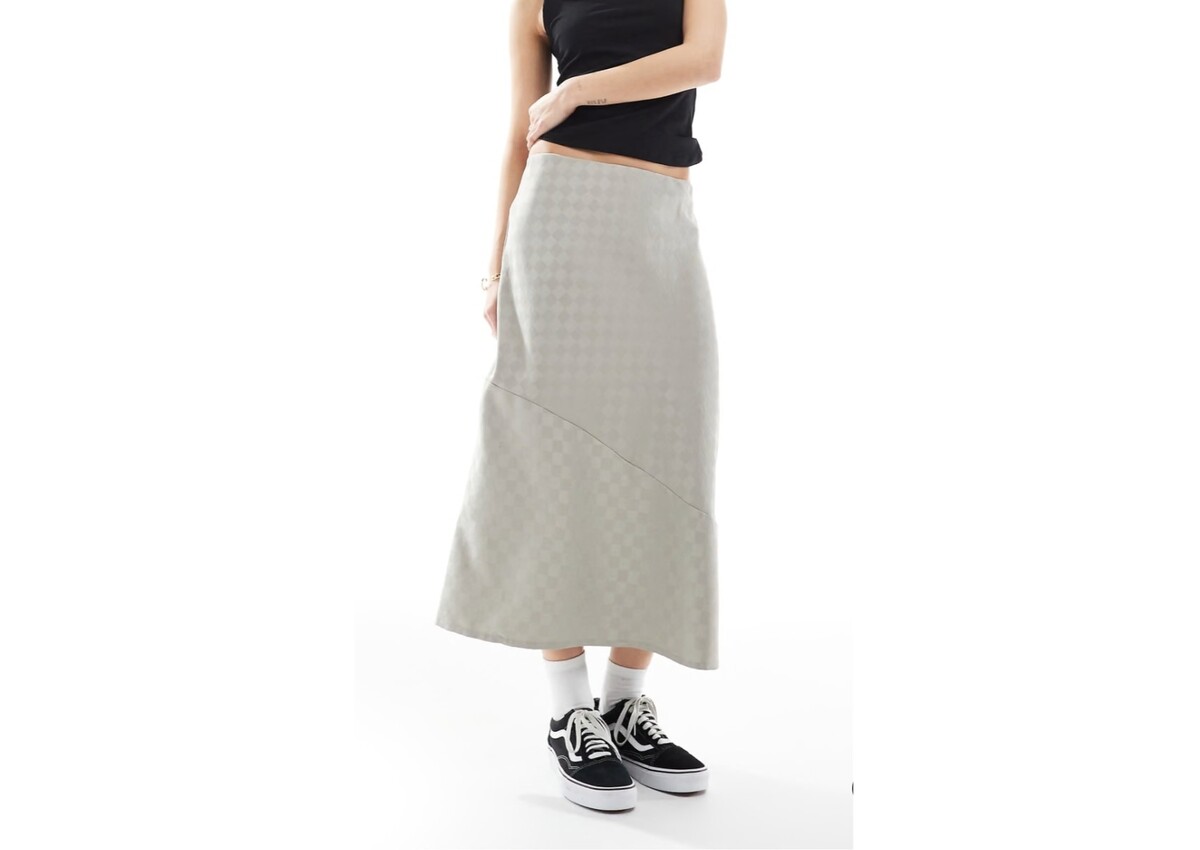 With a flattering bias cut panel and side slit that allows for easy movement, the Diana Column Checkerboard Skirt offers an elevated take on a retro style with a satiny charmeuse fabric featuring a subtle woven check print.