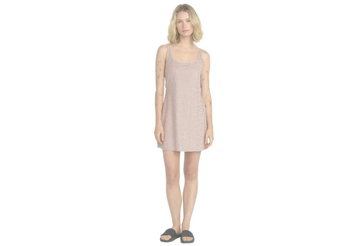 This fitted terry jacquard mini dress combines soft, textured style with endless comfort. A flocked allover print offers eye-catching visual flair while the simple, flattering silhouette allows you to move freely. Complete with subtle signature branding, this dress blends standout personality with laid-back ease.