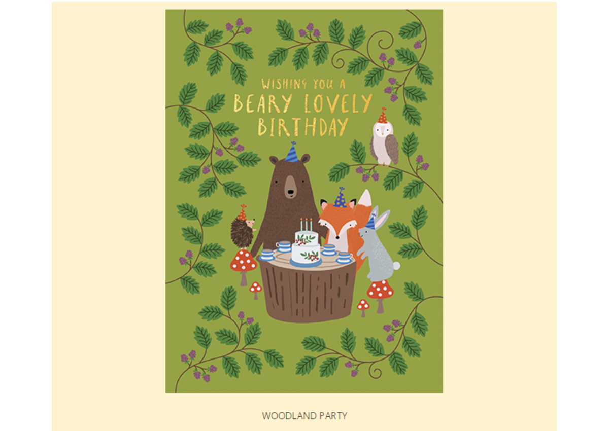 Birthday card. Printed in the USA on recycled textured paper, using vegetable-based inks. Comes with color-coordinated envelope made of recycled paper. Packaged in cello jacket. Features a decorative foil.